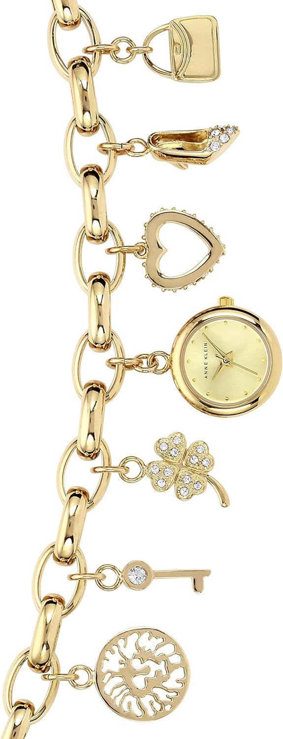 Anne Klein Women's Premium Crystal Accented Gold-Tone Charm Bracelet Watch, 10/7604CHRM