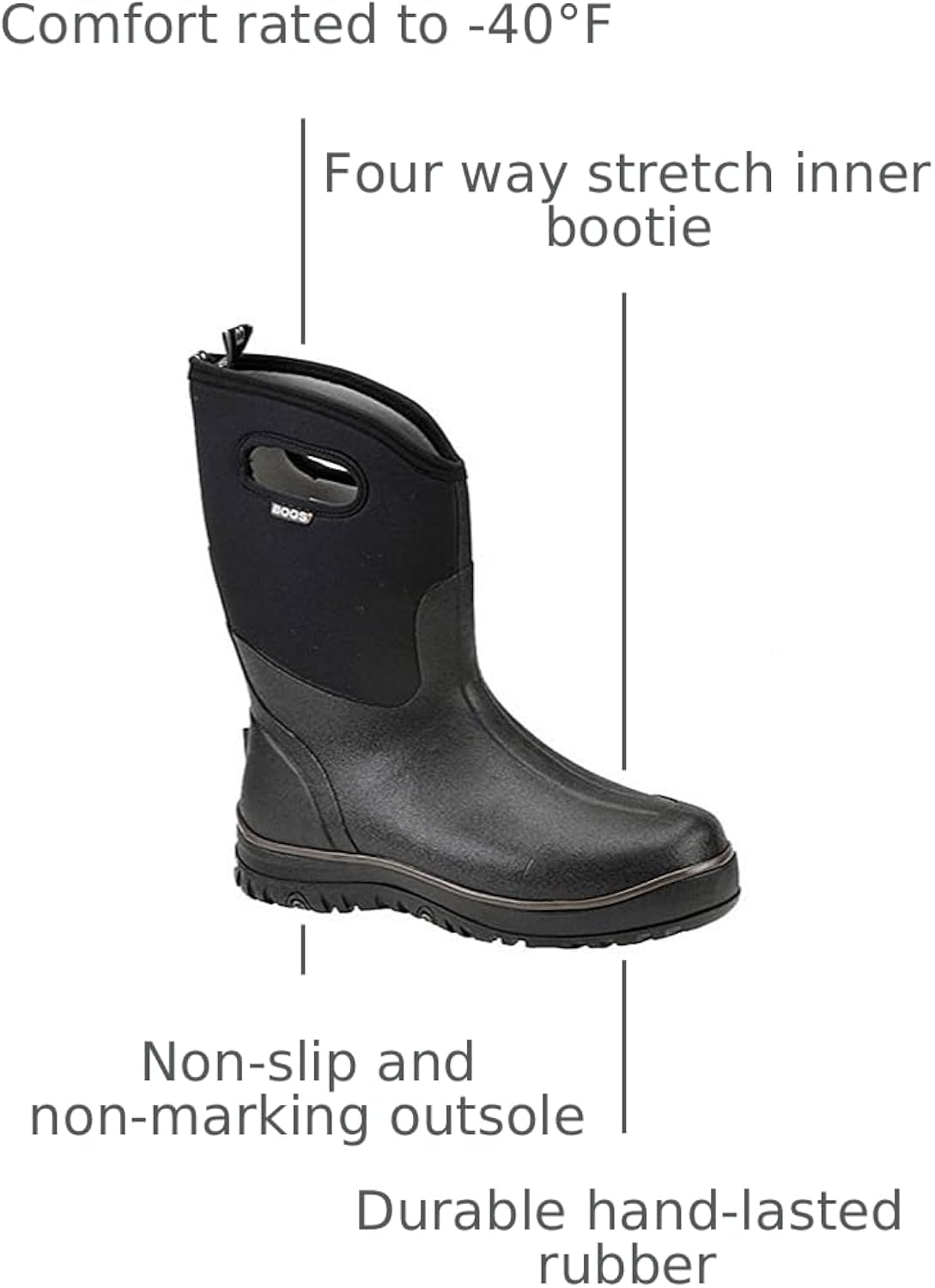 Durable hand-lasted rubber and a four way stretch inner bootie