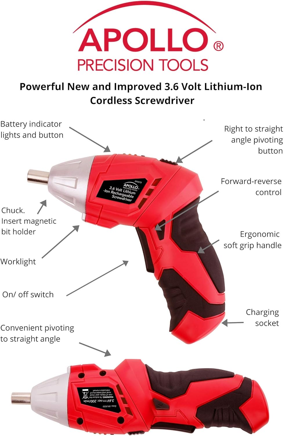 UPGRADED 3.6 VOLT LITHIUM-ION RECHARGEABLE SCREWDRIVER has two positions: straight and screw gun; It is powerful, has an easy forward/reverse mechanism and a bright LED to light up work areas; A power gauge lets you know when it’s time to recharge