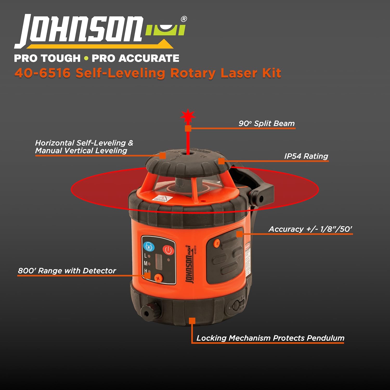 ROTARY LASER LEVEL: This Johnson Self Leveling Kit is ideal for various indoor and outdoor jobs. Perfect for small jobsites; this rotary tool self-levels in the horizontal plane and levels manually in the vertical plane.