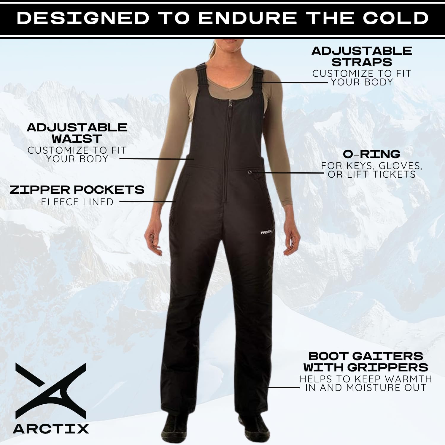 ADDED FEATURES: Fleece-Lined Hand Warmer Zip Pockets for added security; O-ring for keys, gloves, and lift tickets; Boot Gaiters with Grippers form a seamless integration with boots to keep the warmth in and moisture out.