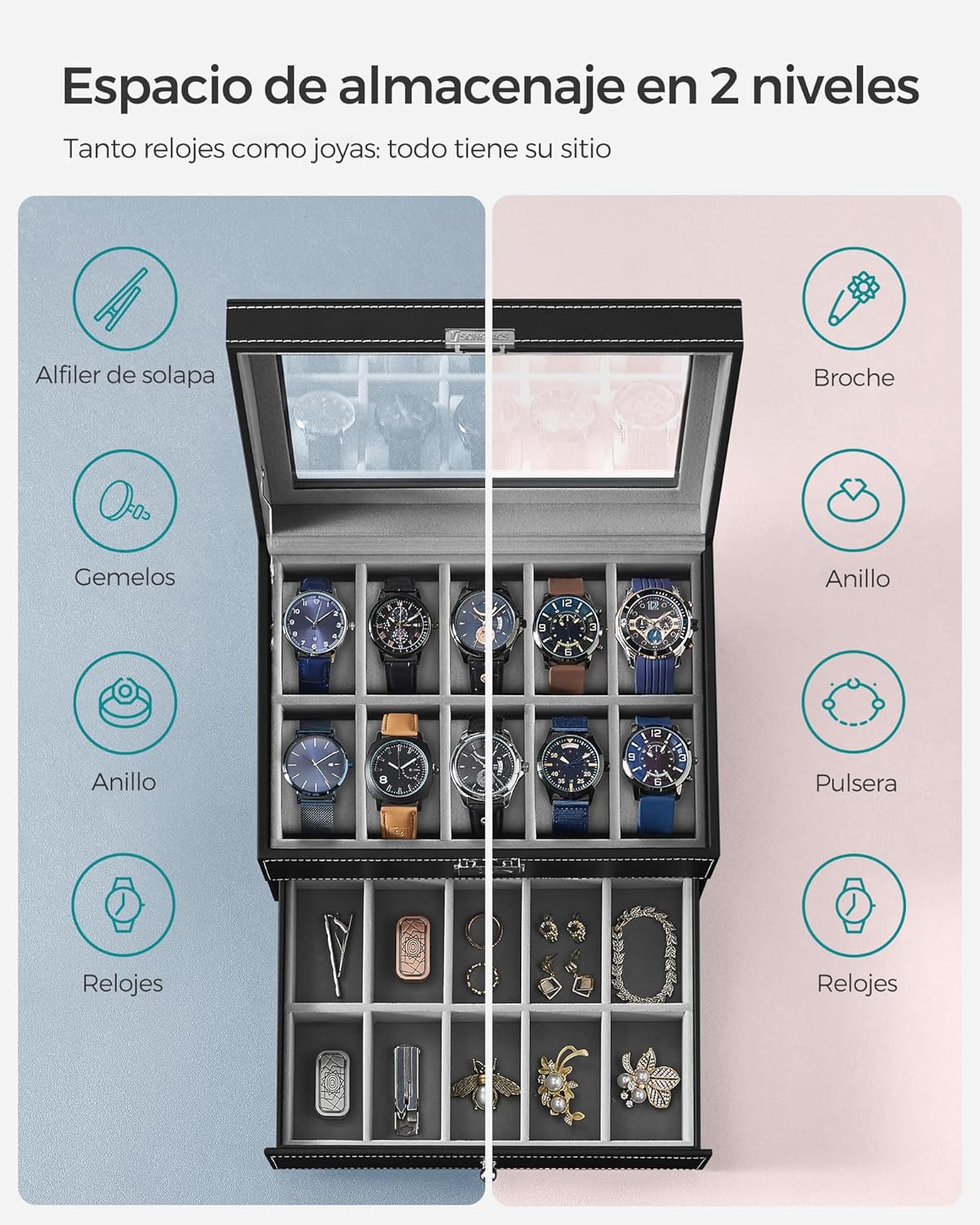 SONGMICS 20-Slot Watch Box, Watch Case with Glass Lid, 2 Layers, Lockable Watch Display Case, Black Synthetic Leather, Gra...