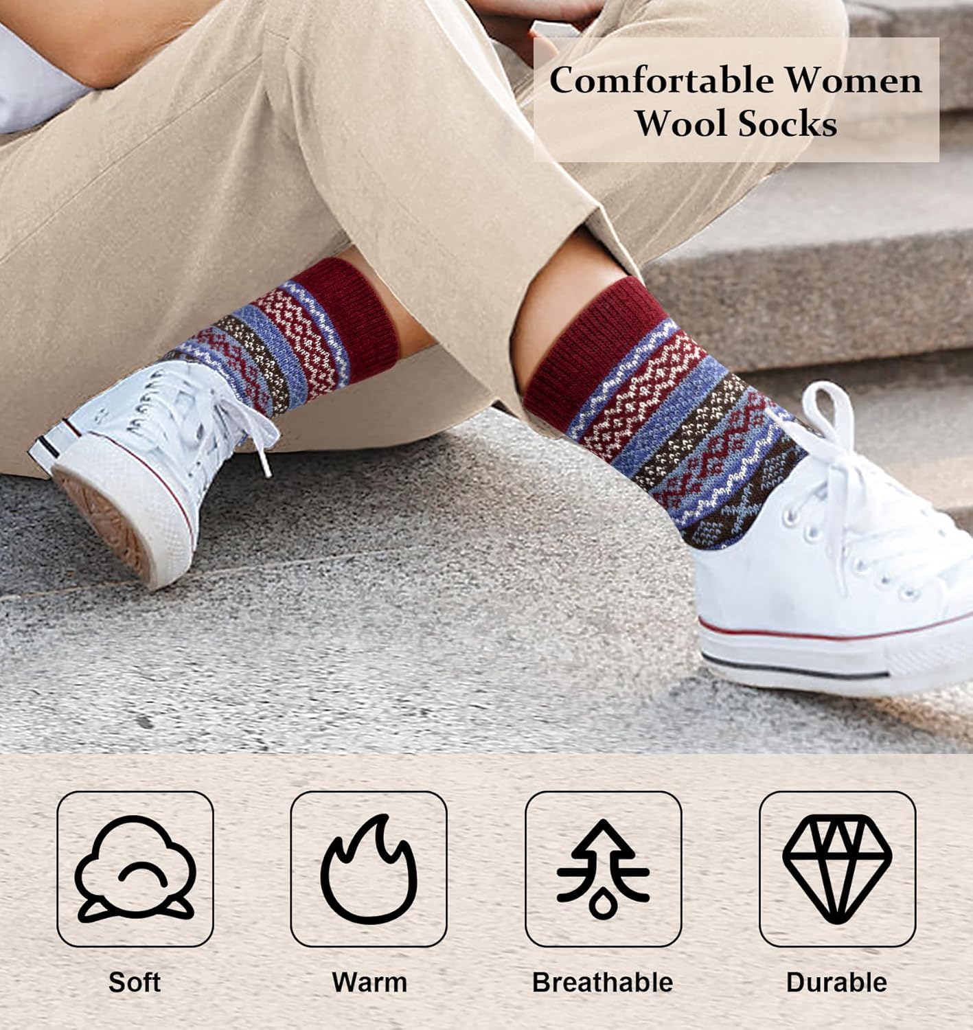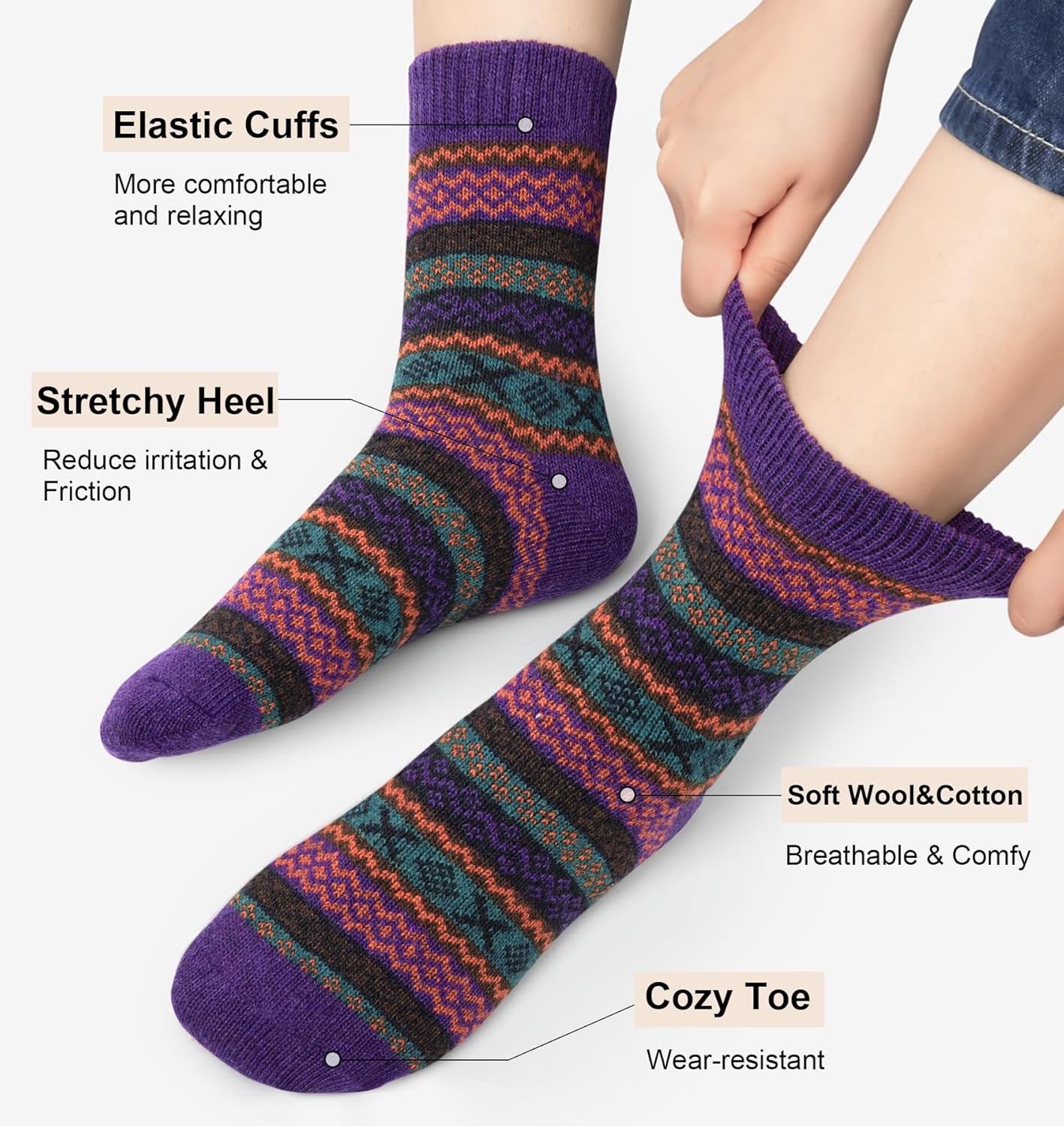 5 In 1 Pack: 5 pairs warm socks for women are in each package; The style and colors of these cozy wool socks can easily follow your daily collocation, such as your favorite rain boots, sneakers, ski boots