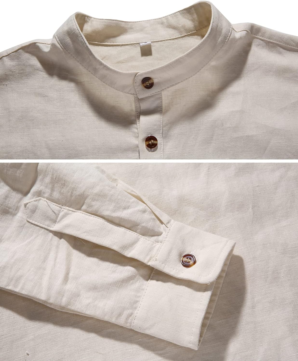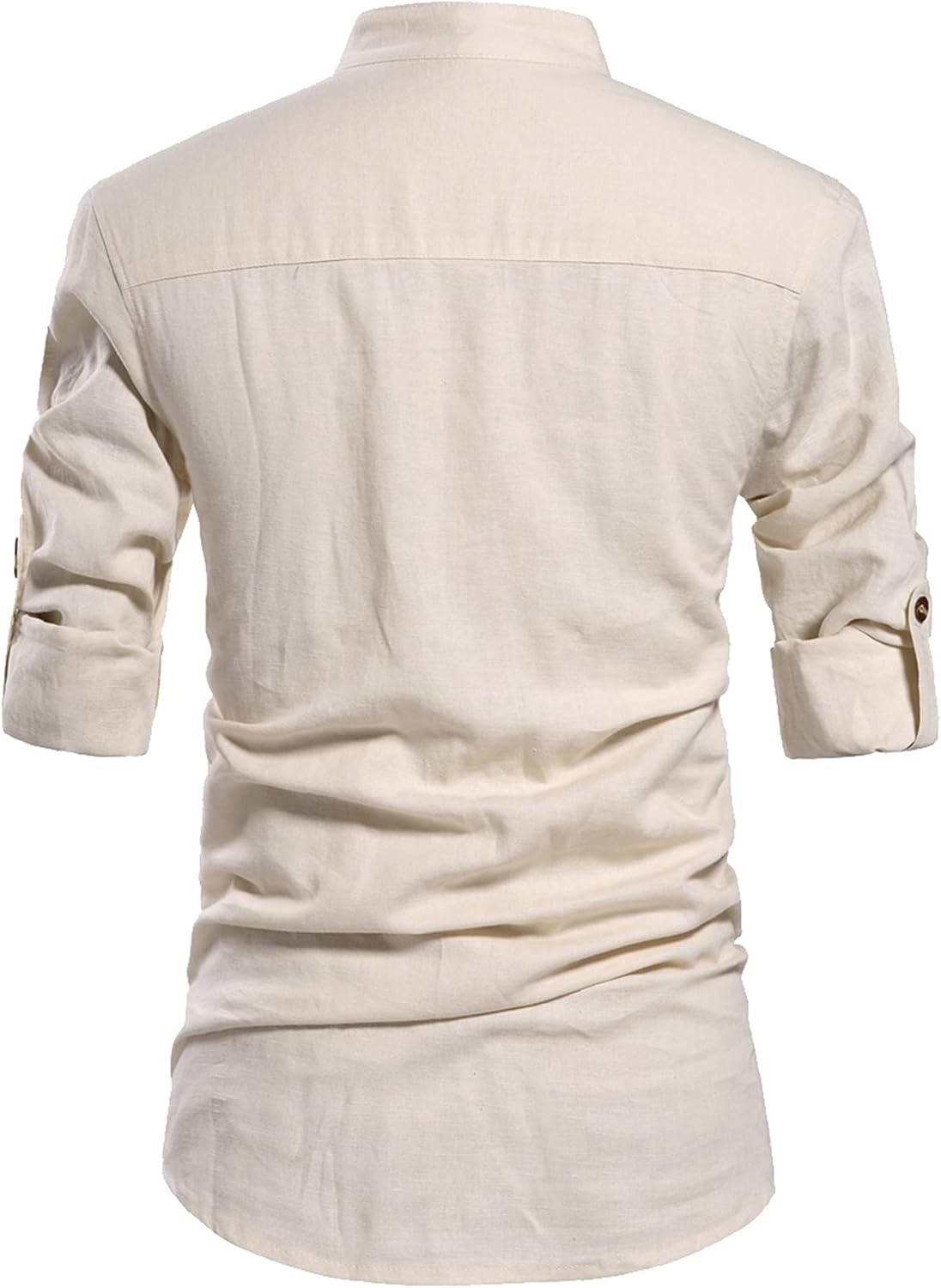 Casual henley shirts, Roll-up Sleeves, Long Sleeve linen shirts, Button Front, Stand collar, featured button detail.