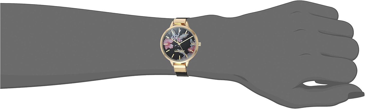 Black textured dial with 3d printed floral design; gold-tone hands and markers