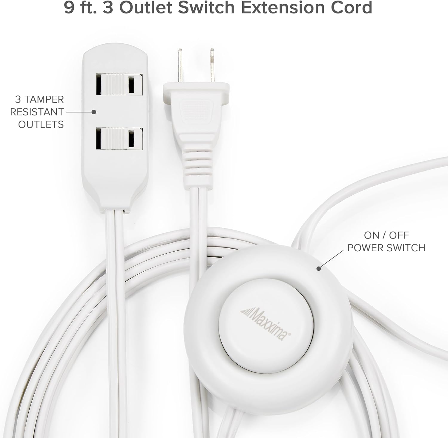 9 Feet Cord Length - This 9-foot extension cord features an on/off tap 3 feet from the plug and 6 feet from the outlet. Comes in a 2 pack.