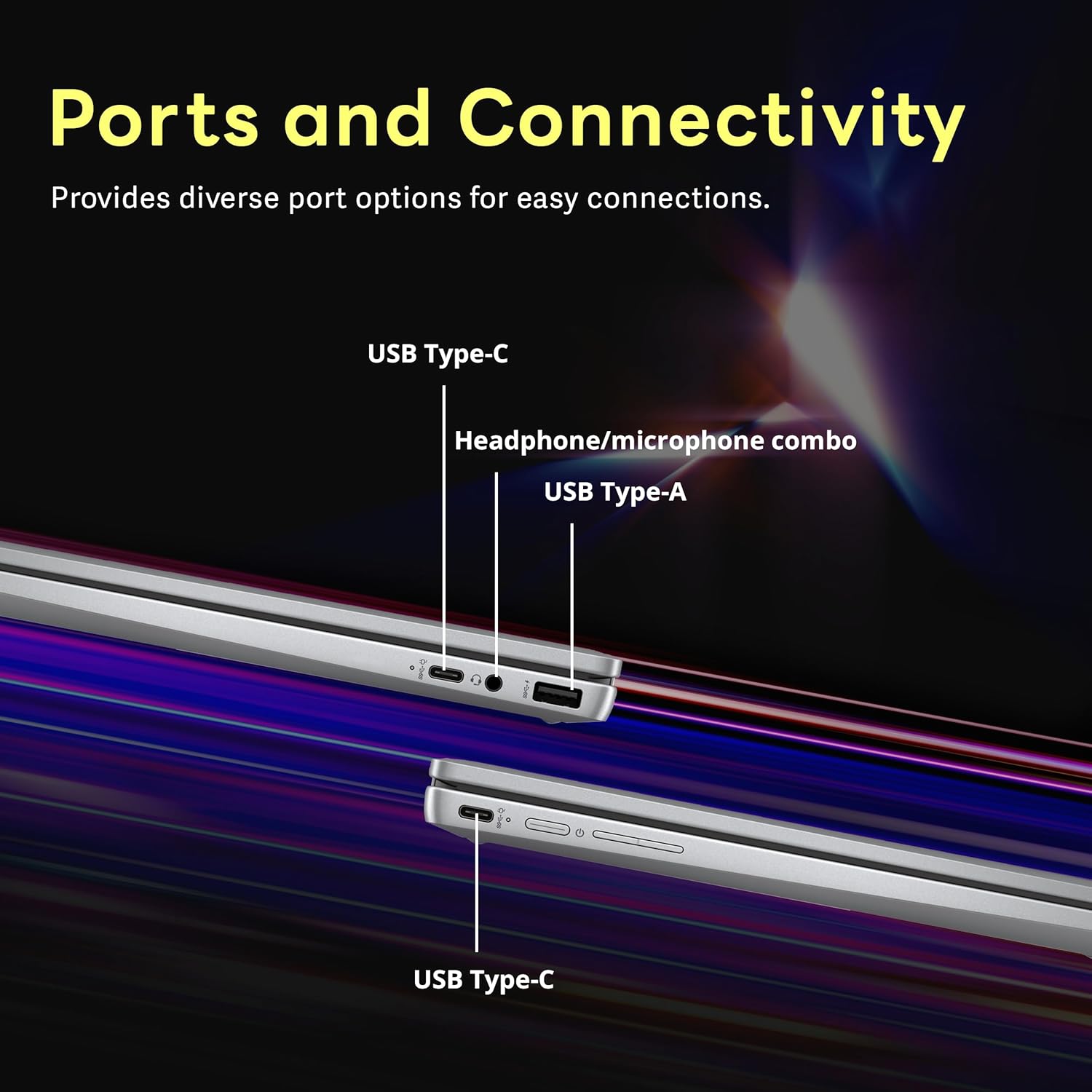 【Chrome OS】Chrome OS is secure, fast, up-to-date, versatile, and simple. 【Dimensions & Weight】12.72 x 8.28 x 0.81 inches, 3.03 lbs. 【Ports】2 x USB-C 3.0, 1 x USB-A 3.0, 1x Headphone Jack, Wi-Fi 6E + Bluetooth. HD Audio with stereo speakers.【Bonus Docking Station Set】1x 7-in-1 Docking Station w/ 128GB SSD, 1x 32GB MicroSD Card w/ Adapter, 1x Type-C Data Cable, 1x 3-in-1 Charging Cable, 1x Suede Cleaning Cloth.