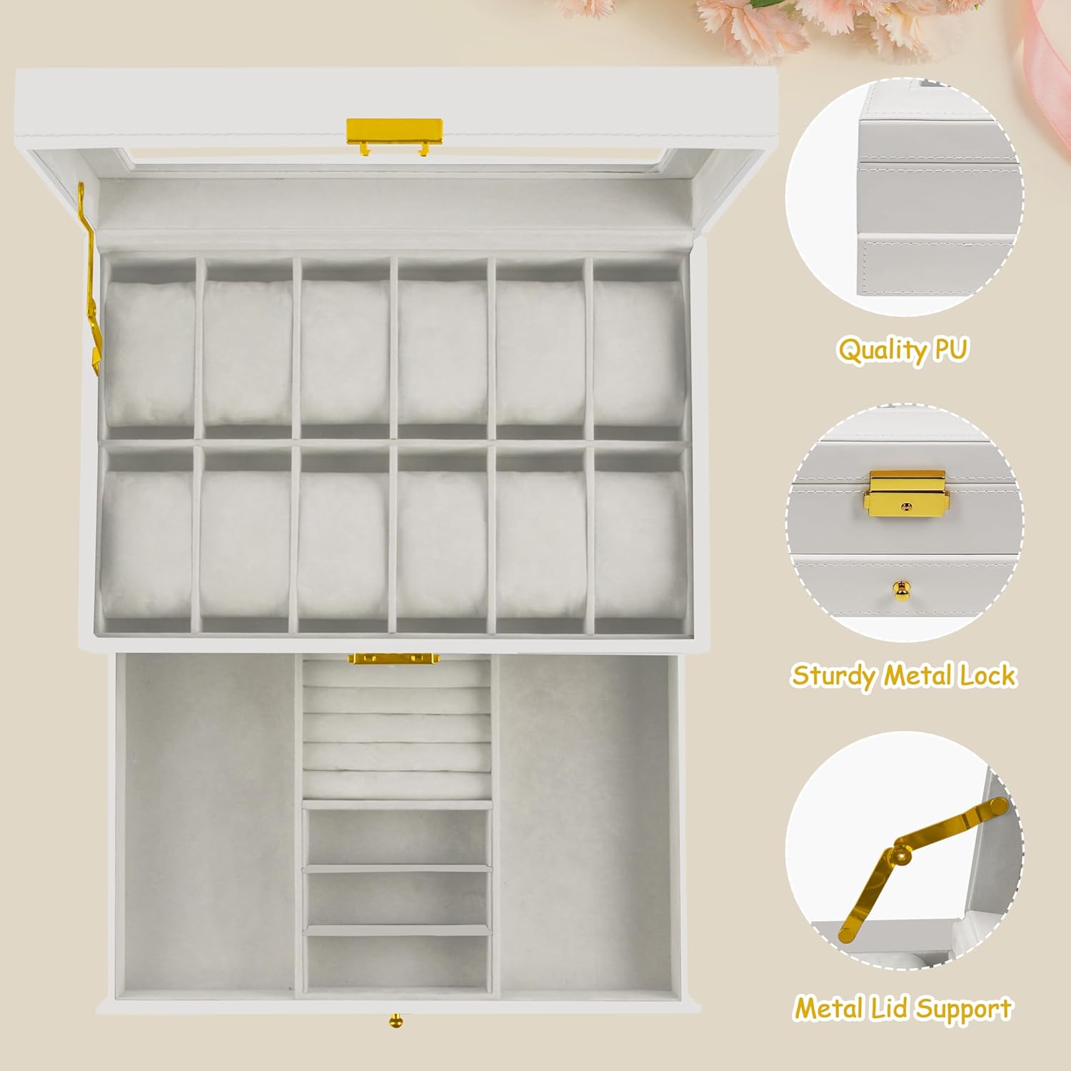 【2 layers Multi-functional Boxes】The top section of the jewelry box features 12 slots for watches, each with a removable velvet cushion. Meanwhile, the bottom section offers ample space for storing cufflinks, necklaces, bracelets, earrings, brooches, sunglasses, and other jewelry and personal items.