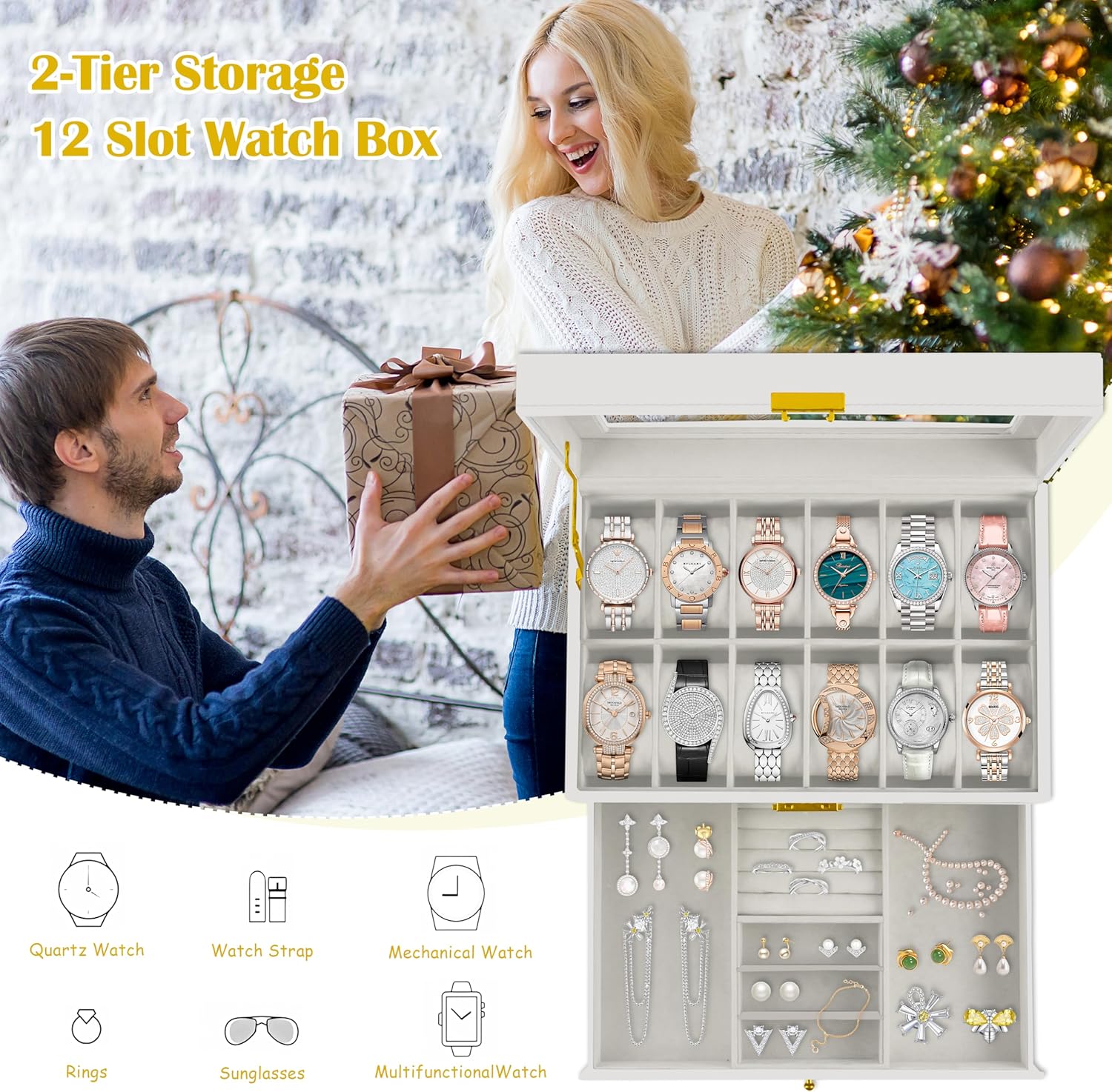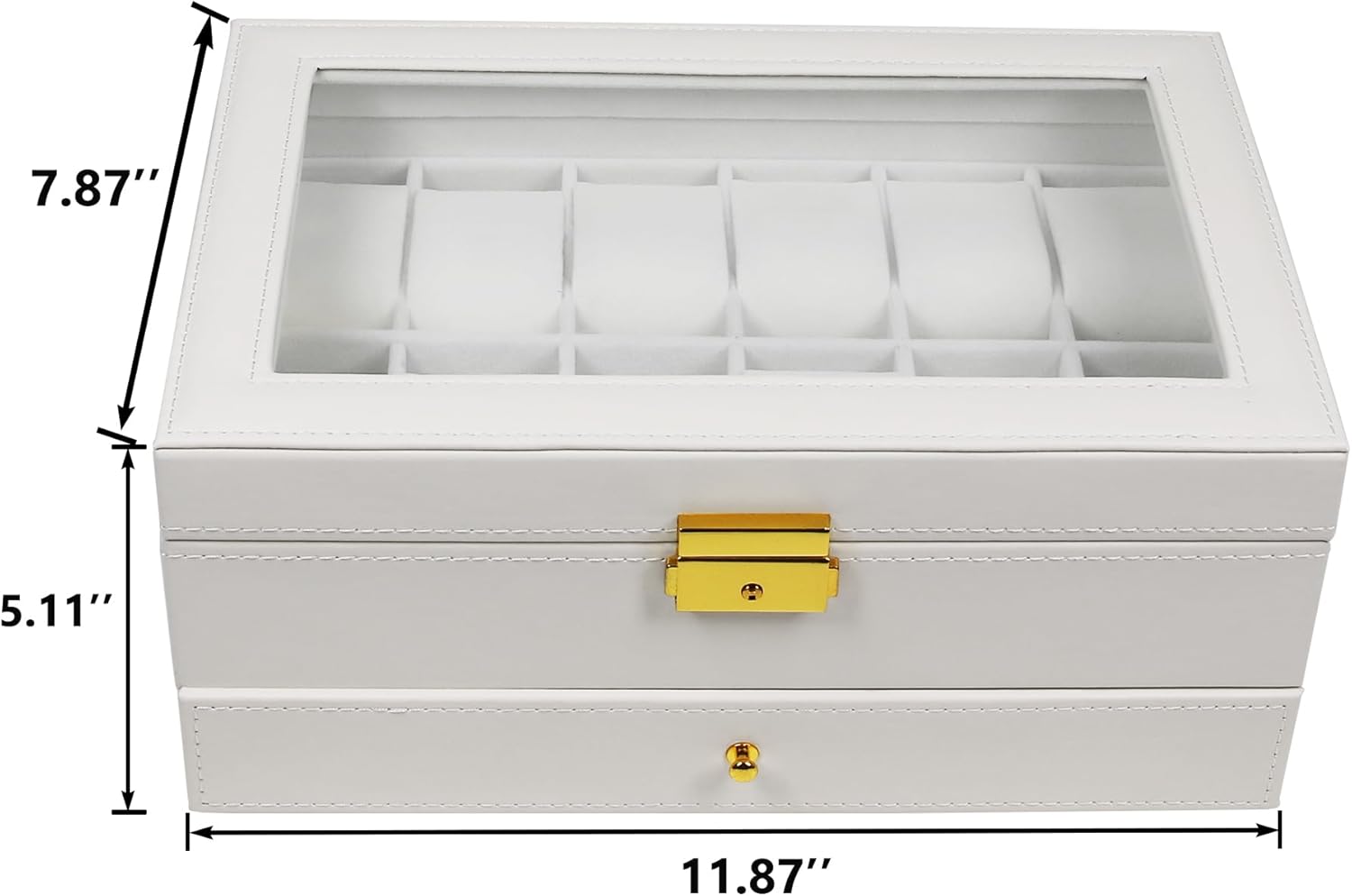 Ogrmar 12 Slot PU Leather Lockable Watch Storage Boxes, Men & Women Jewelry Display Drawer Case, 2-tier Organizer Watch Sh...