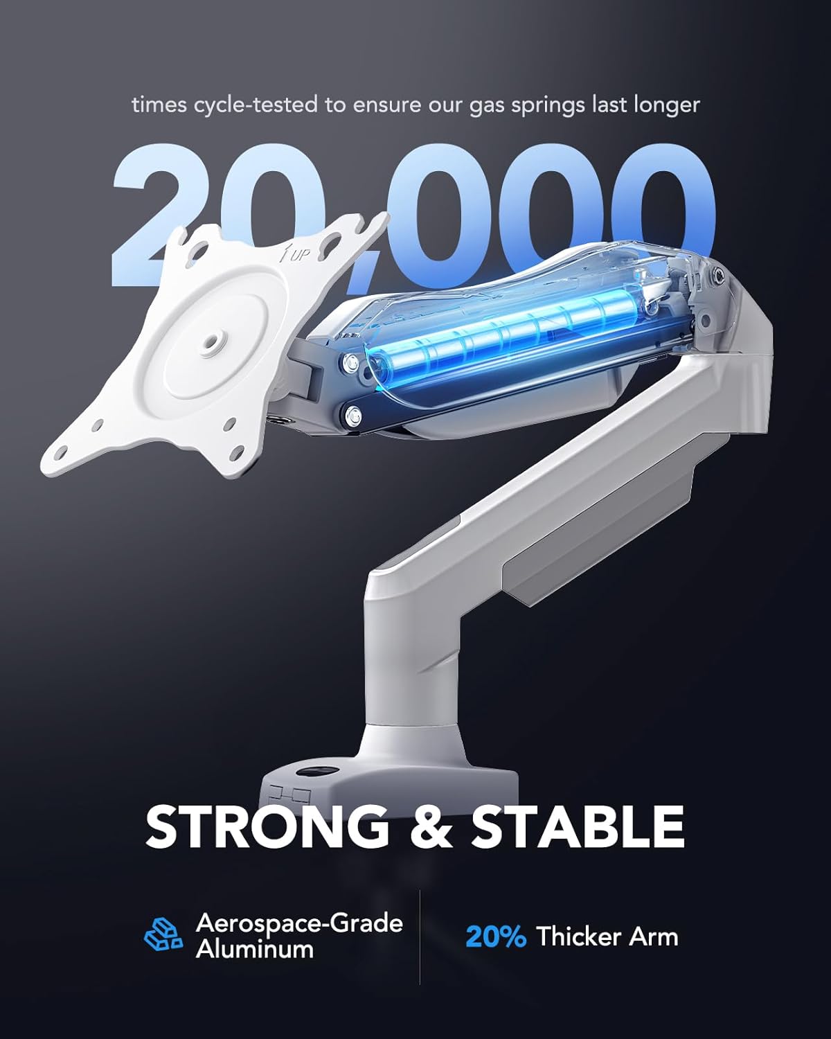 80% Sturdier Than Others: At HUANUO, we focus on improving the strength and stability of our single monitor stand. The single desk monitor mount uses automotive-grade gas spring cores and has undergone 20,000 motion tests, which means it can be used continuously for more than 5 years without issue.