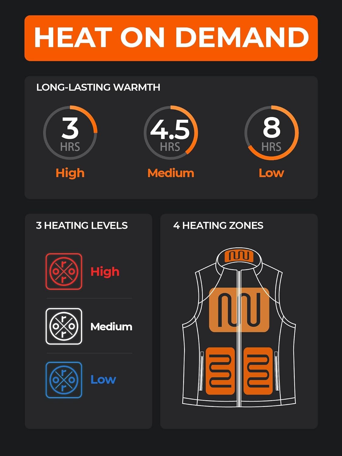 Fast & Long-Lasting Warmth: Powered by a 7.38V UL-certified battery, the vest heats up in seconds and provides hours of consistent warmth. Built-in USB-A port lets you charge your phone or other devices on the go.