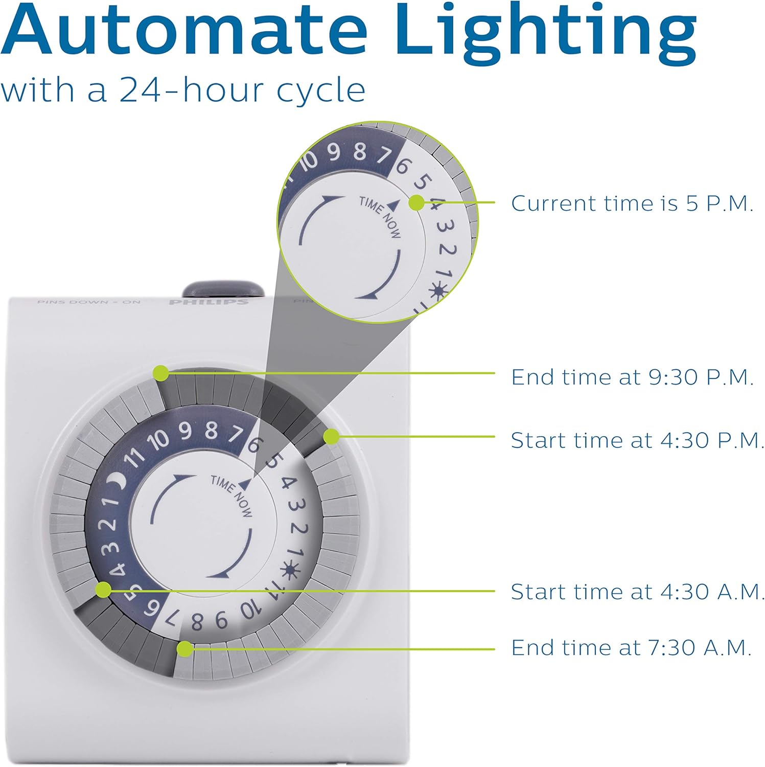 Automate Lighting – With a 24-hour cycle, the timer provides daily control using 30-minute intervals to personalize ON/OFF times and varied schedules
