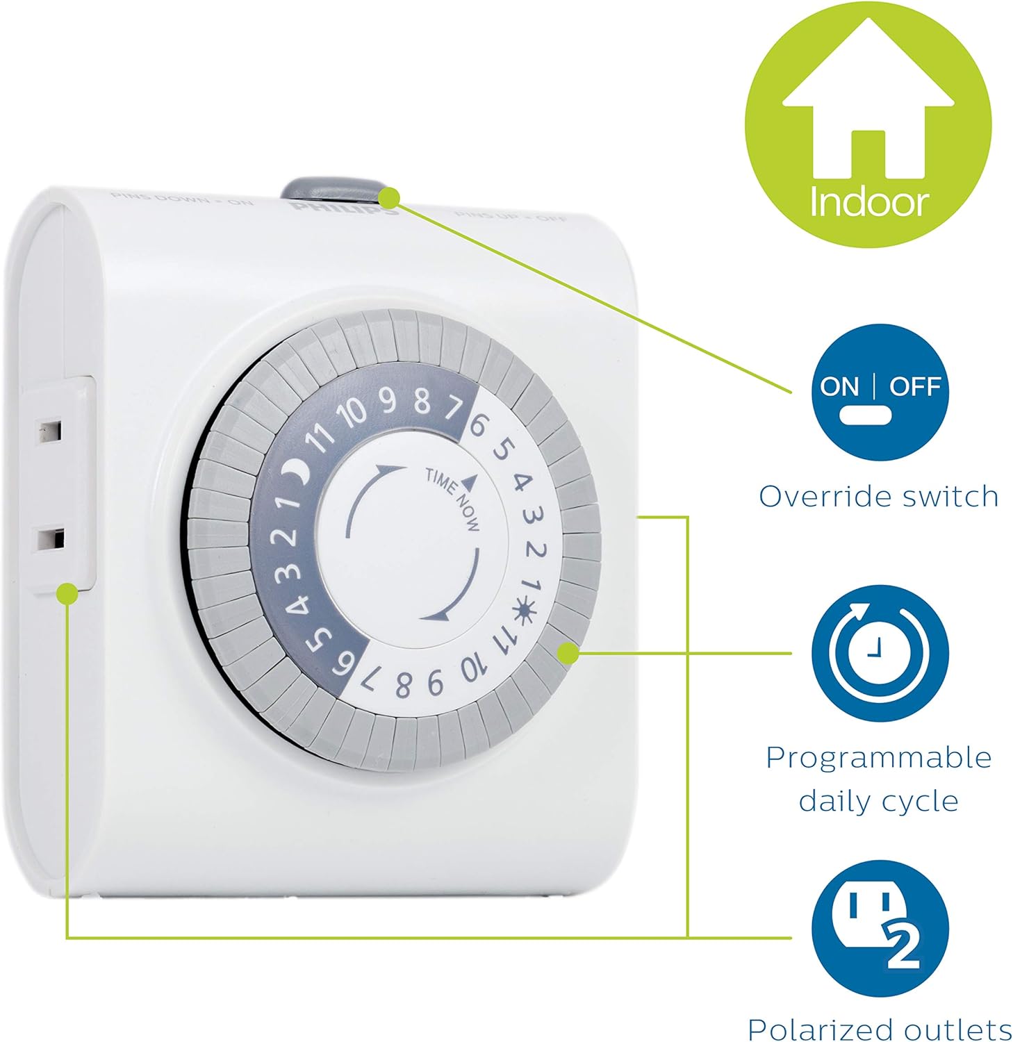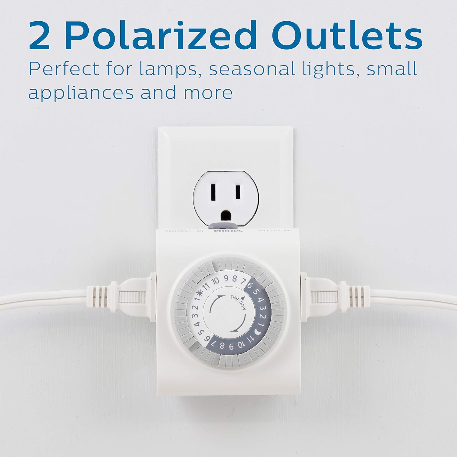 2 Polarized Outlets – This timer plugs into any indoor, grounded outlet to provide power and features 2 timed, polarized outlets to automate your devices
