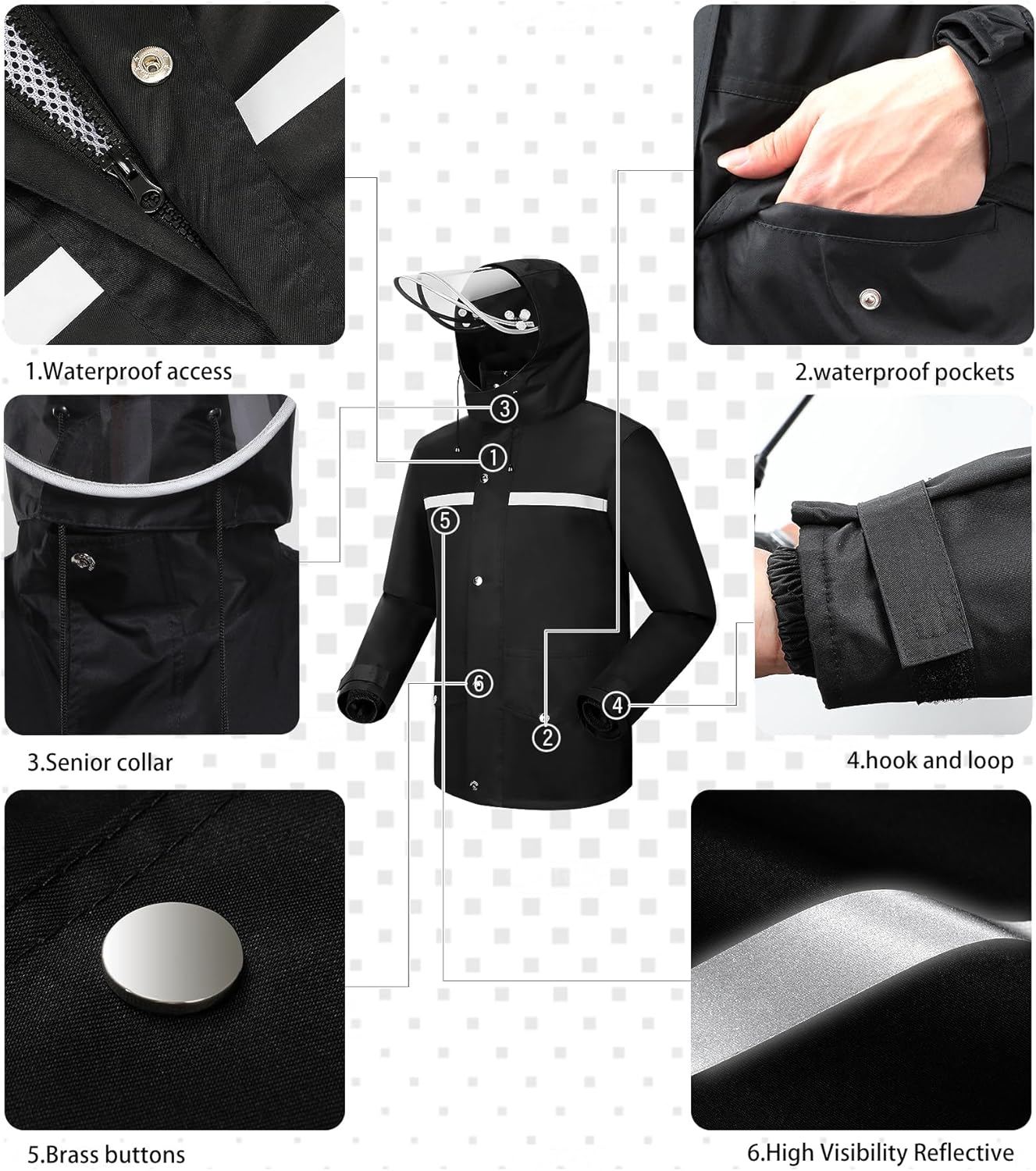 Fabric: This raincoat is made of high-tech Nano polyester pongee 240T lotus leaves style waterproof fabric, it is waterproof, soft, comfortable, anti-oxidant, non-degumming, odorless and so on