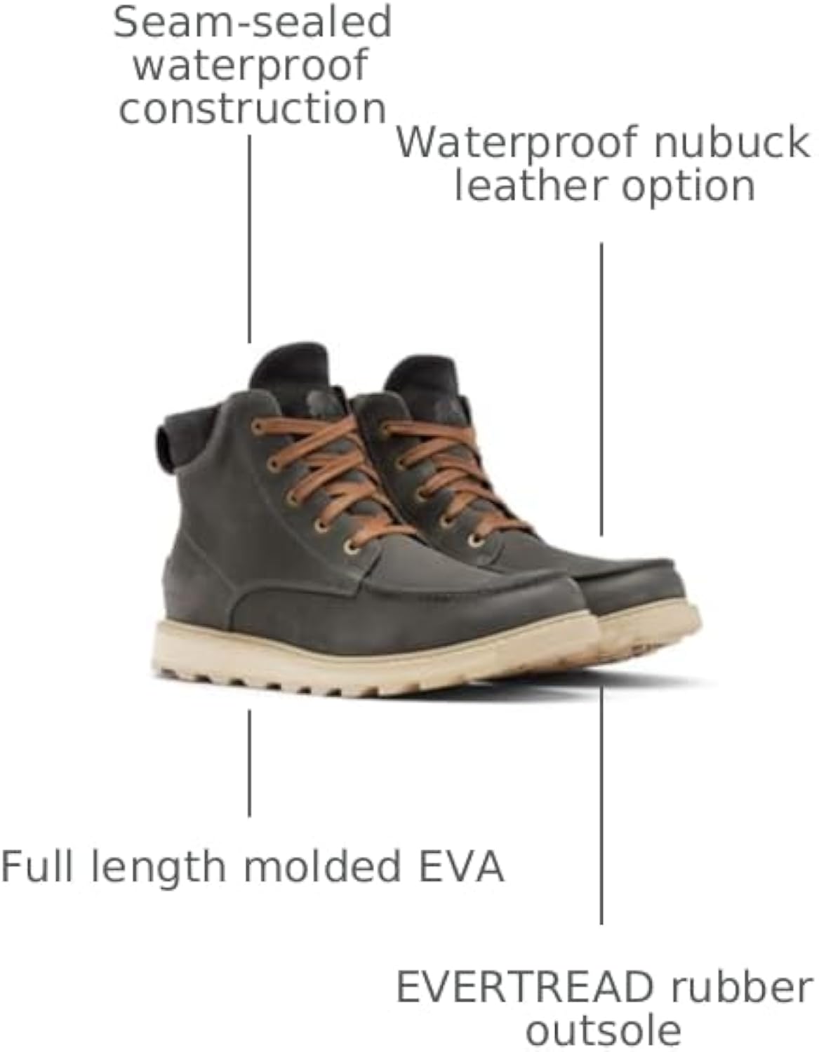 Available in waterproof nubuck leather (CW 256, 048) or waterproof full grain leather (CW 243). Suede collar and tongue top. Combination textile and synthetic lining package. Seam-sealed waterproof construction. Laces are not waterproof