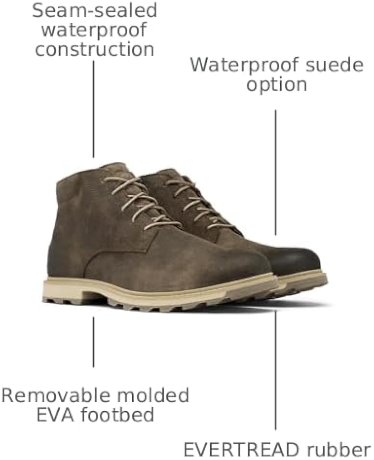 Available in waterproof suede (CW 245) or waterproof full grain leather (CW 243, 256). Synthetic and textile lining. Seam-sealed waterproof construction. Laces are not waterproof