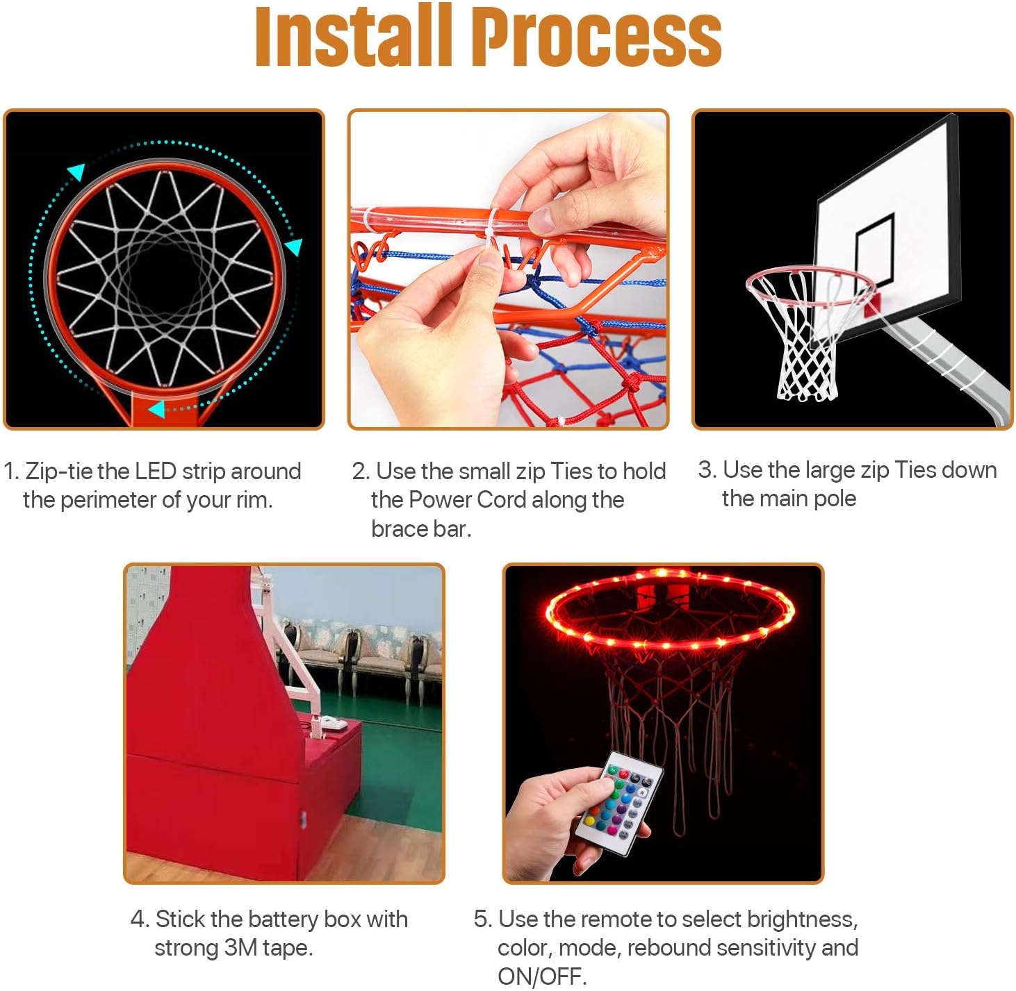 【GOOD GIFT FOR KIDS】: Designed for basketball fans who playing at night. Fit the size of the standard basketball frame. Package included:1x LED strap light, 1x battery box(AA batteries not included),10x small zip ties, 5x large zip ties, 1x 3M adhesive pads. 1-year replacement service.