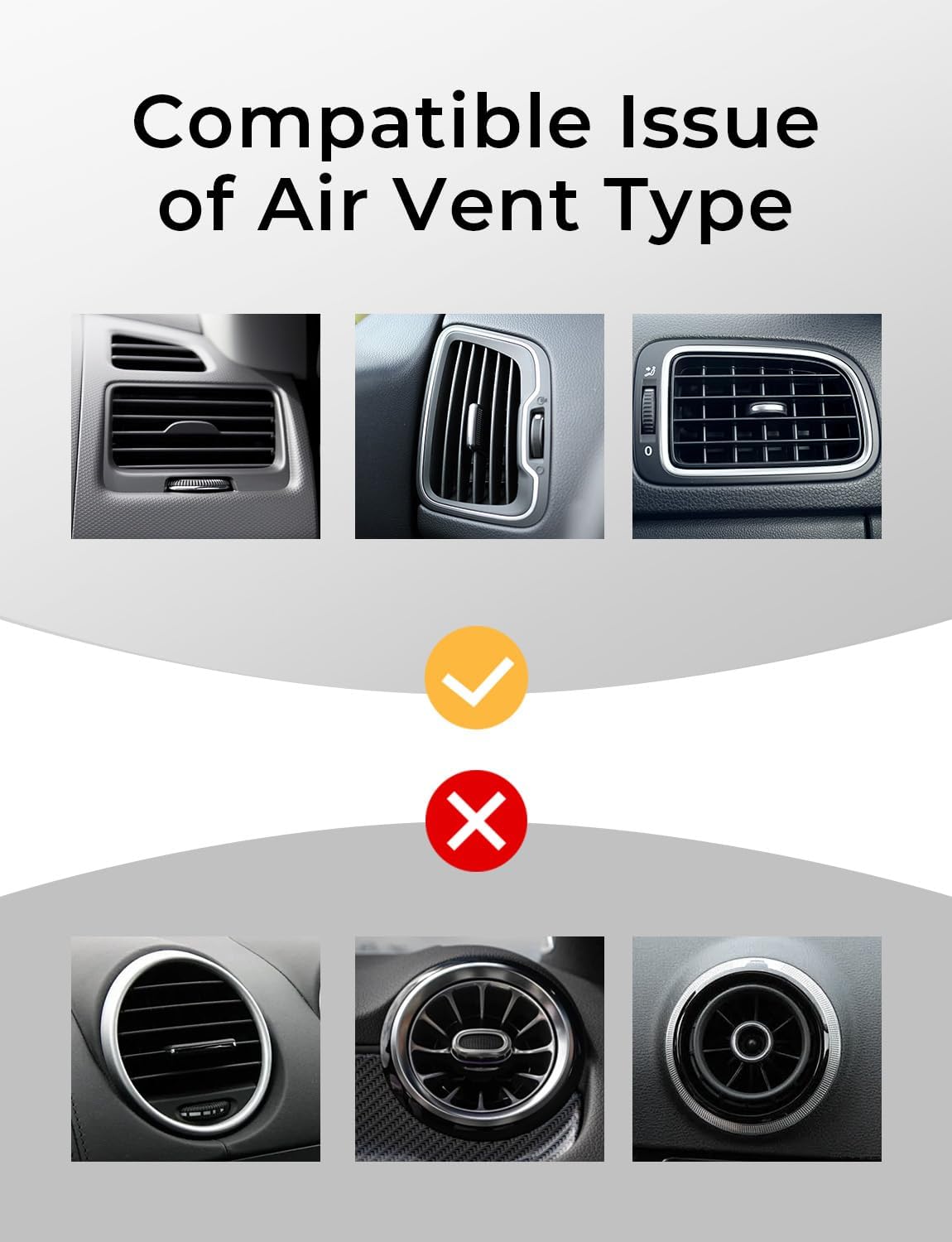 UPGRADED AIR VENT HOOK: This car vent phone holder mount is designed as "Hook shape" and form "Three grasp points" which can firmly hook around the a/c vent for no slippage or movement. This car vent clip solving the market's common problem of falling forward and off the air vent constantly when going over bumps or turns. NOTE: THE LENGTH OF CLAMP BETWEEN 0.5-1.41IN. THIS VENT CAR PHONE HOLDER NOT COMPATIBLE WITH CIRCLE AIR VENT