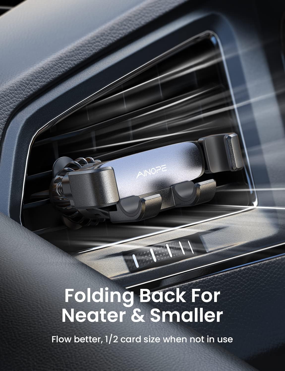 NO BLOCK VENT & SAFER DRIVING: This vent car mount for iPhone with folding back structure is very neat and keep it small when not in use, only 1/2 card size and 3 inches away from the vent to still allow air flow. You can have a wider sight and adjust this gravity car phone mount vent up/down or left/right. NOTE: THE HORIZONTAL MODE IS NOT SUPPORTED.
