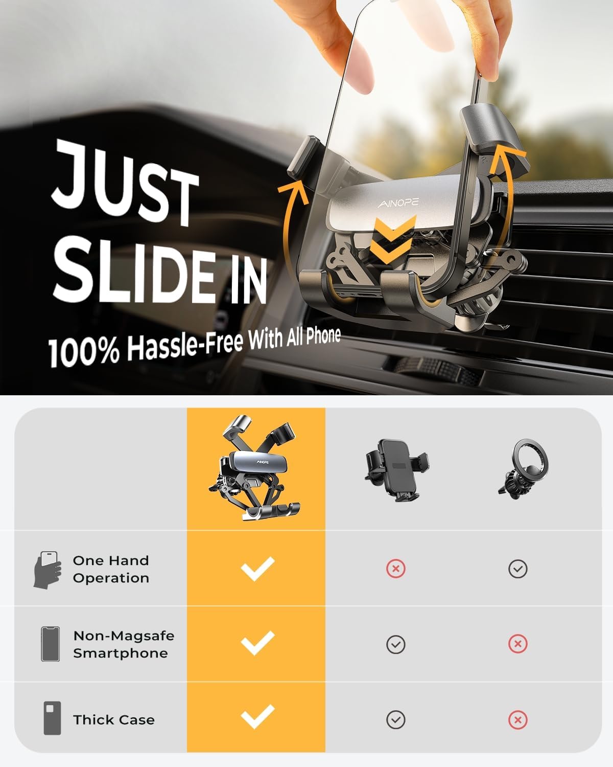 THE EASIEST OPERATION & JUST SLIDE IN AND GO: Just slide in your phone, car vent phone mount holder clamps the phone automatically by gravity and provide the easiest operation and a strong stable hold without button to press. Compaired to old air vent phone holder for car , you no longer free hands to spend too much time in looking down to place phone while reseting the navigation route. When getting off car in a hurry, just pick up phone and leave in seconds.