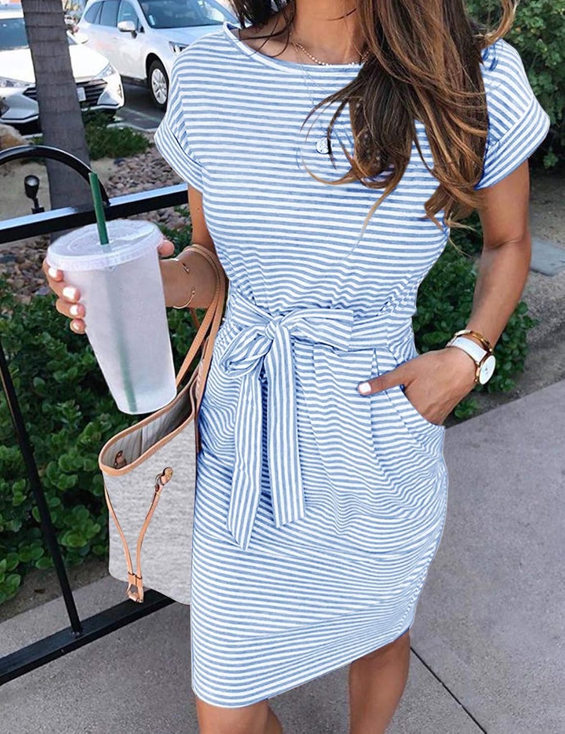 Unique Design: sheath dress with two side pockets, crew neck, about knee length, slim fit self tie belted waist, classic stripes, soft and stretchy cotton blend dress, dress for women.