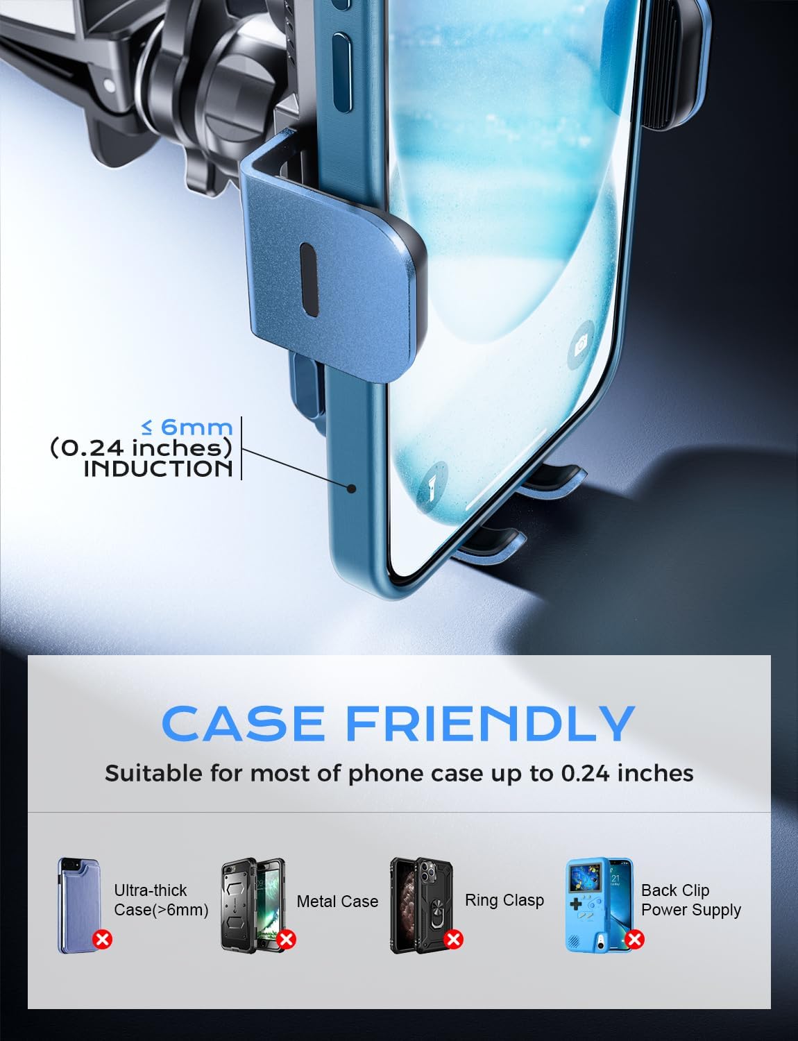 【Intelligent Identification & Smart Charging】Experience effortless and safe driving with our phone car mount. It automatically clamps your phone when connected, providing convenience and enhanced safety. The charger's arms open with a simple touch on the 2 sides button. Plus, it intelligently powers off and protects your phone's battery when it's fully charged.