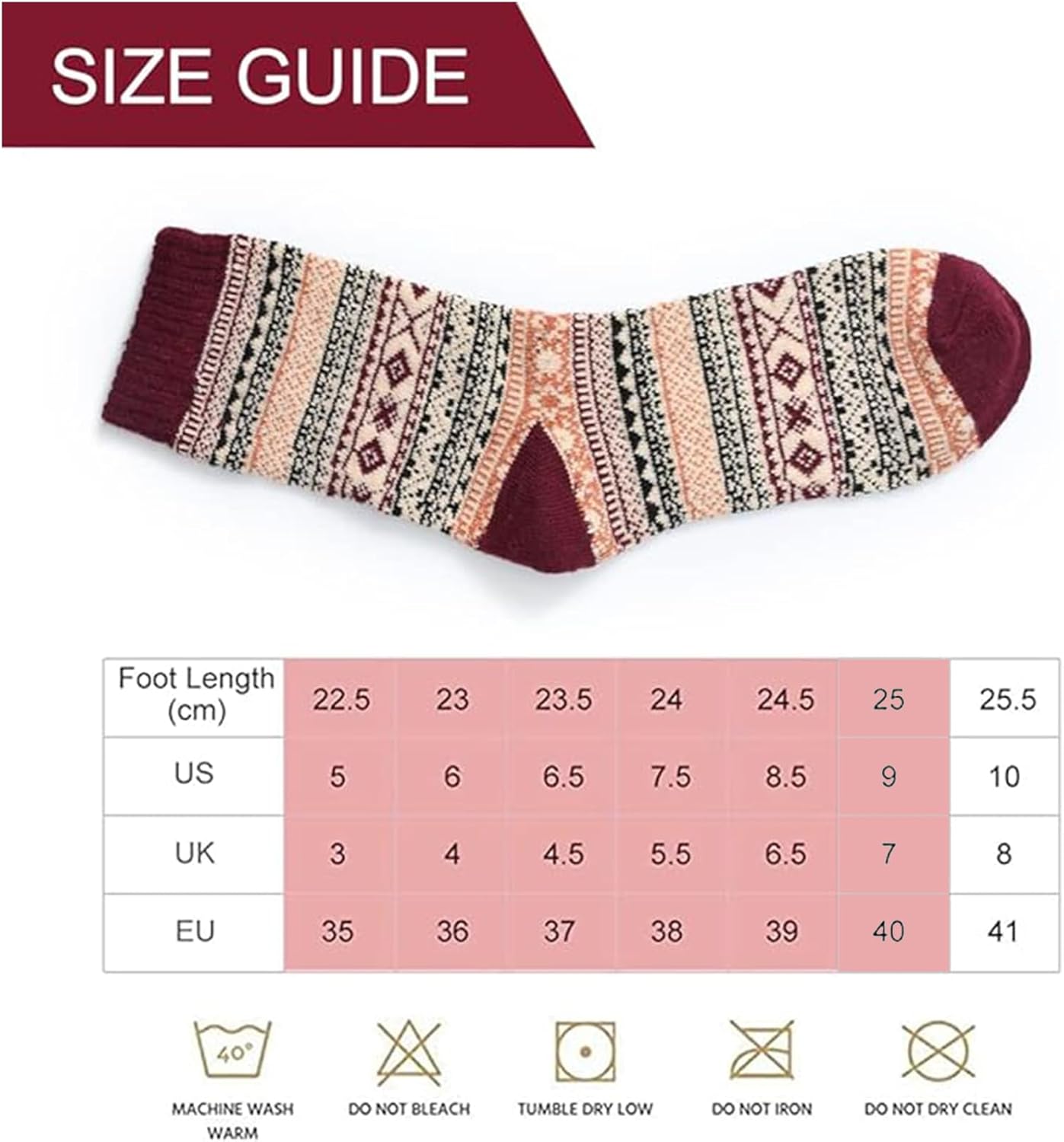 【SIZE】The size of women's winter warm socks is between 25-30cm, suitable for American shoe sizes 5-9. The material of women's warm socks is equipped with elastic support to better wrap your soles. This socks is very suitable for your sports Shoes, boots and snow boots.