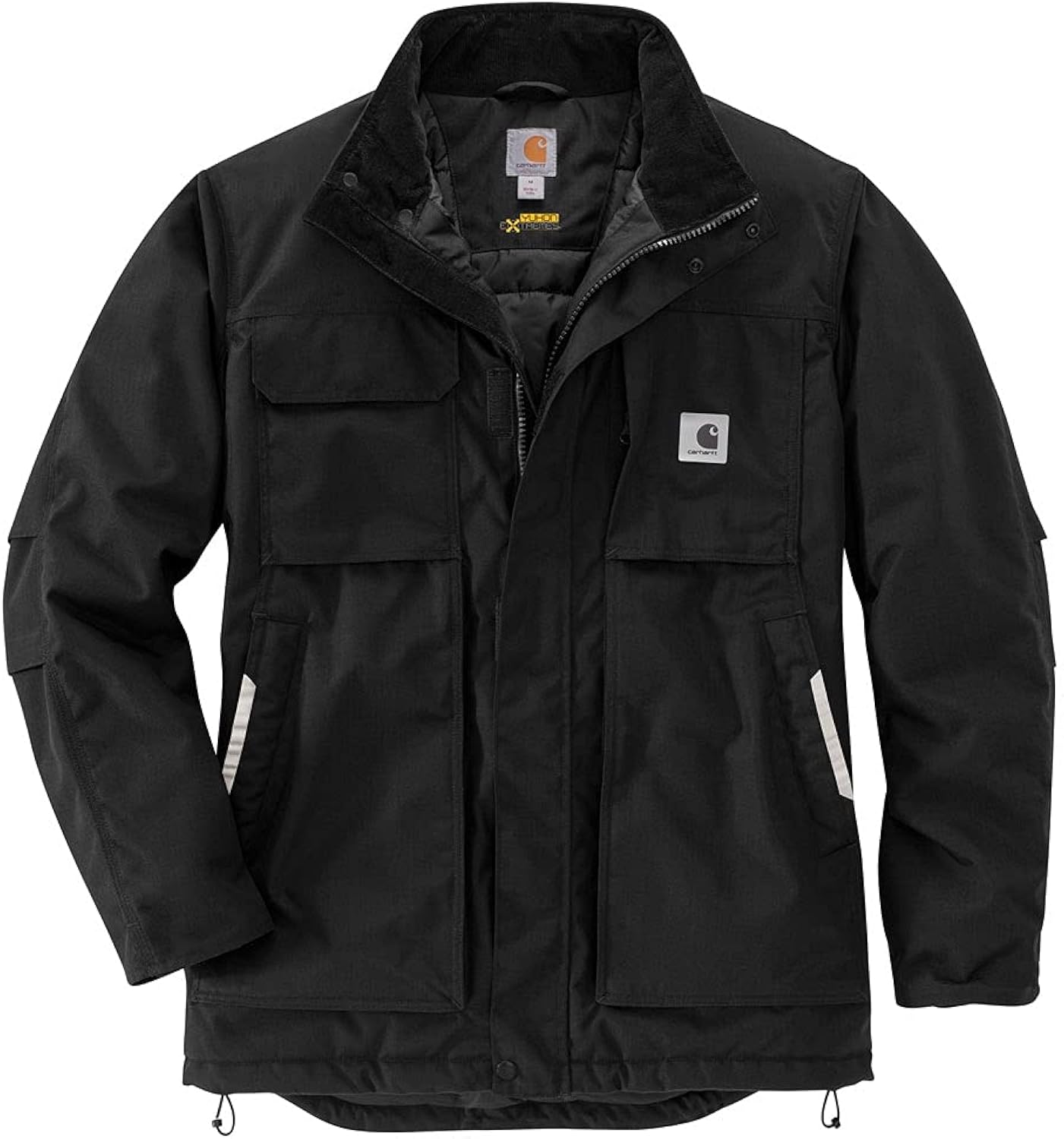Corduroy-trimmed collar with hood snaps, Rib-knit storm cuffs, Droptail hem, 3M reflective Carhartt patch