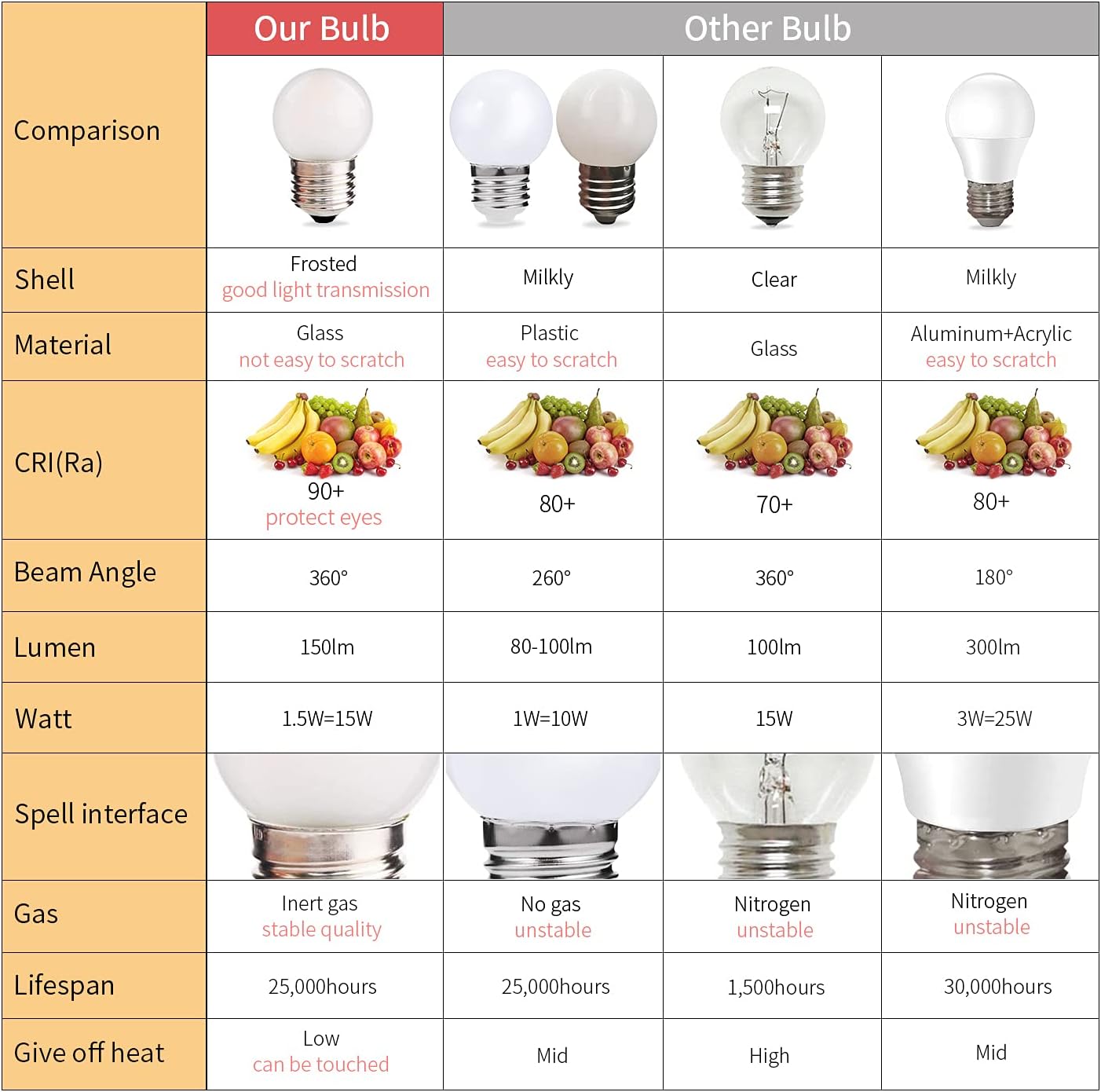 Energy saving led bulbs: G40 led string light bulbs have a candelabra screw base that fits E26 sockets. Each piece 120v 1.5w equivalent to 15 watt traditional incandescent bulbs. Ul listed waterproof bulbs for indoor and outdoor use