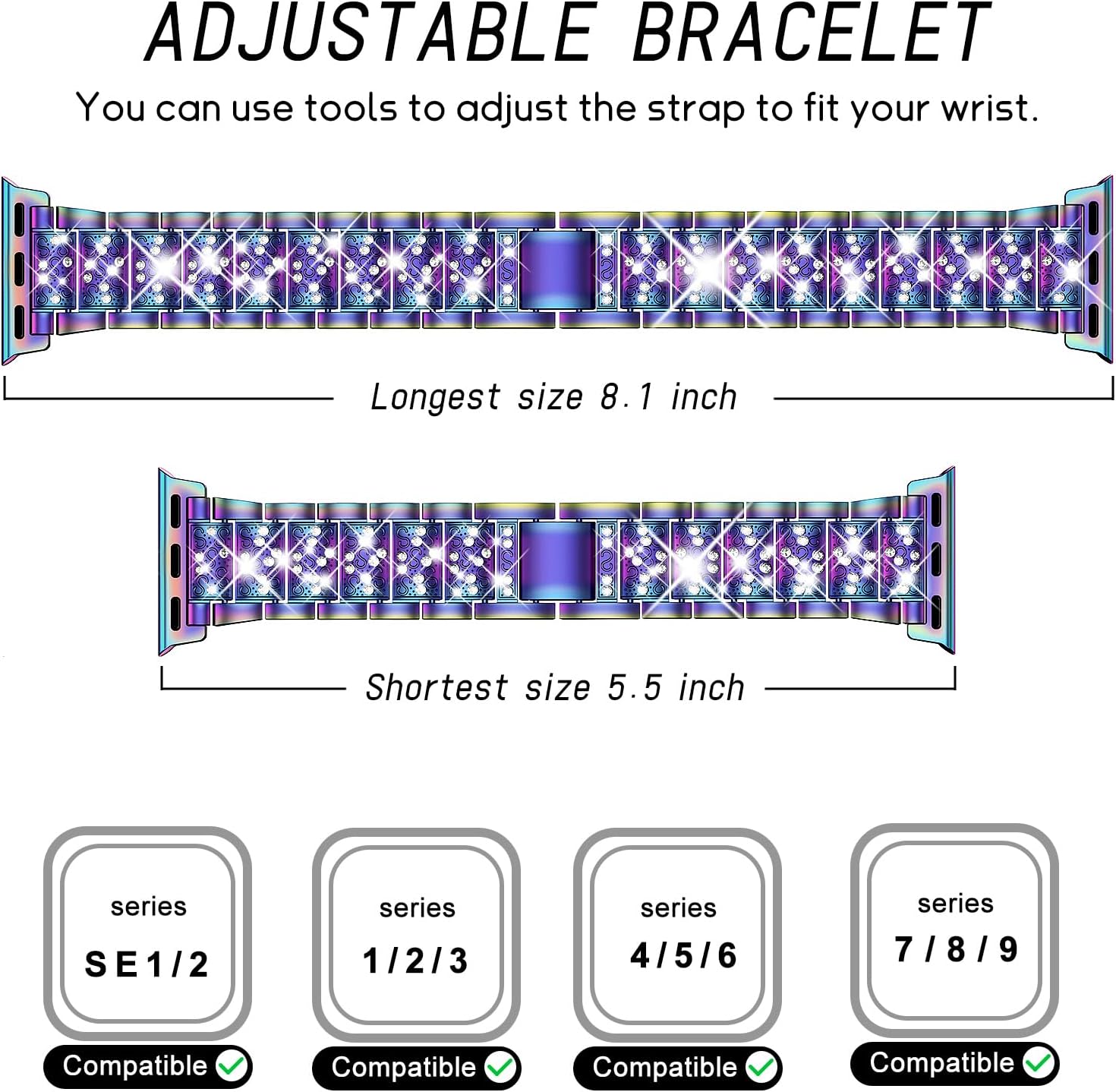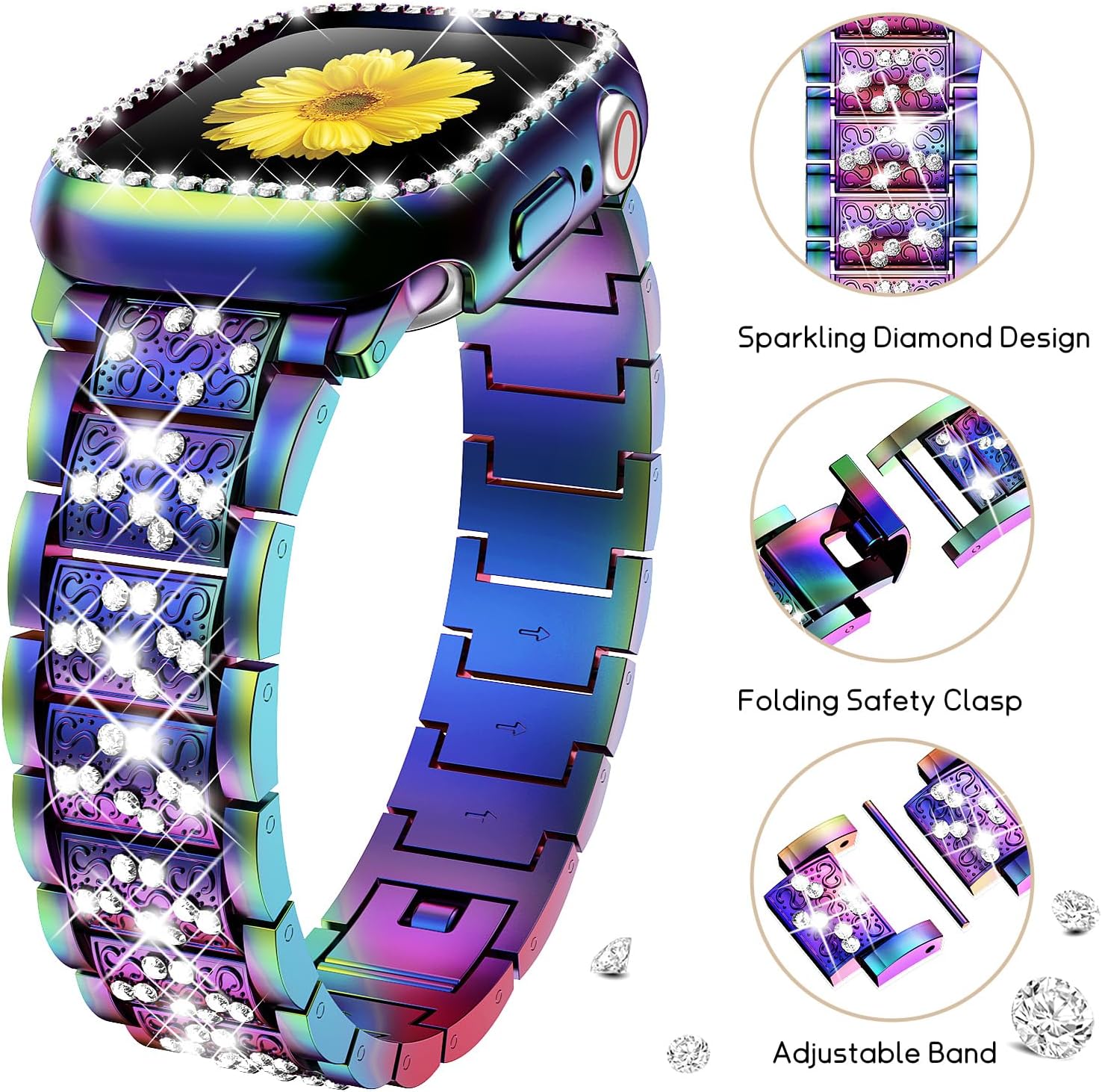 Easy to adjust: The band comes with upgraded resizing tool and clear instruction, you could easily remove the extra links for the watch band to fit your wrist perfectly. The bling protective watch cases with Precise Cutouts for functional buttons and ports, you can easy snap on and take off the case, Do not affected the band insertion or watch charging.