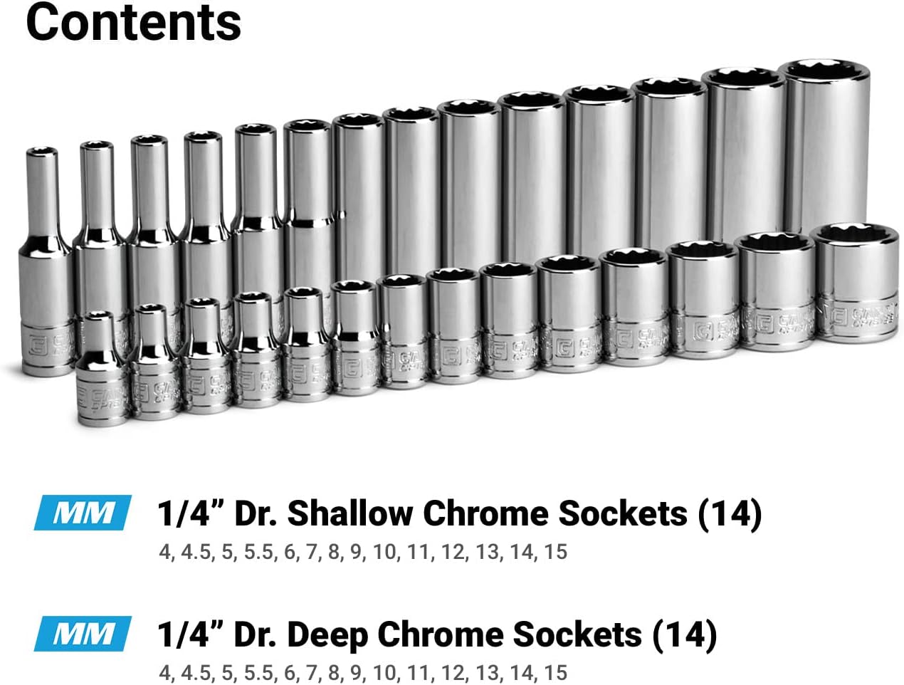28-piece set includes (14) 1/4 in. drive 12-point deep sockets: 4, 4.5, 5, 5.5, 6, 7, 8, 9, 10, 11, 12, 13, 14, 15 mm, (14) 1/4 in. drive 12-point shallow sockets: 4, 4.5, 5, 5.5, 6, 7, 8, 9, 10, 11, 12, 13, 14, 15 mm