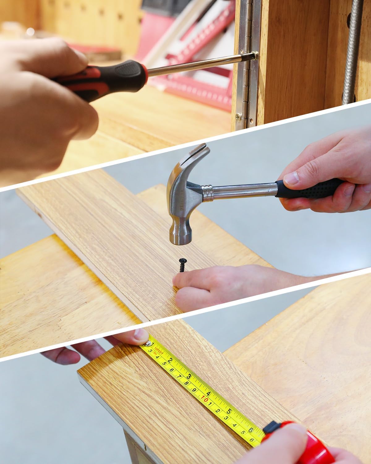 [Complete Varieties] - 8 pieces hex key set, precision screwdrivers, hammer, tape measure, pliers etc. The bit holders, 9mm utility cutter, scissor and 106 pieces fasteners. Variety of 1/4-inch screwdriver bits: Phillips, slotted, square, star and pozi. Soft-grip handle on screwdrivers, pliers and hammer provides excellent comfort and control.