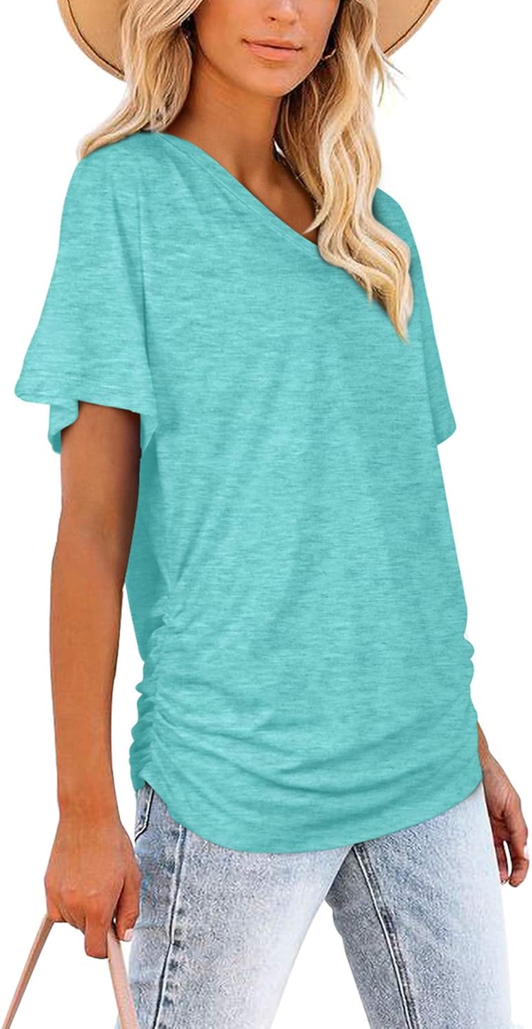 WIHOLL Womens Short Sleeve V Neck Dolman Tops with Side Shirring Loose Fit Shirts