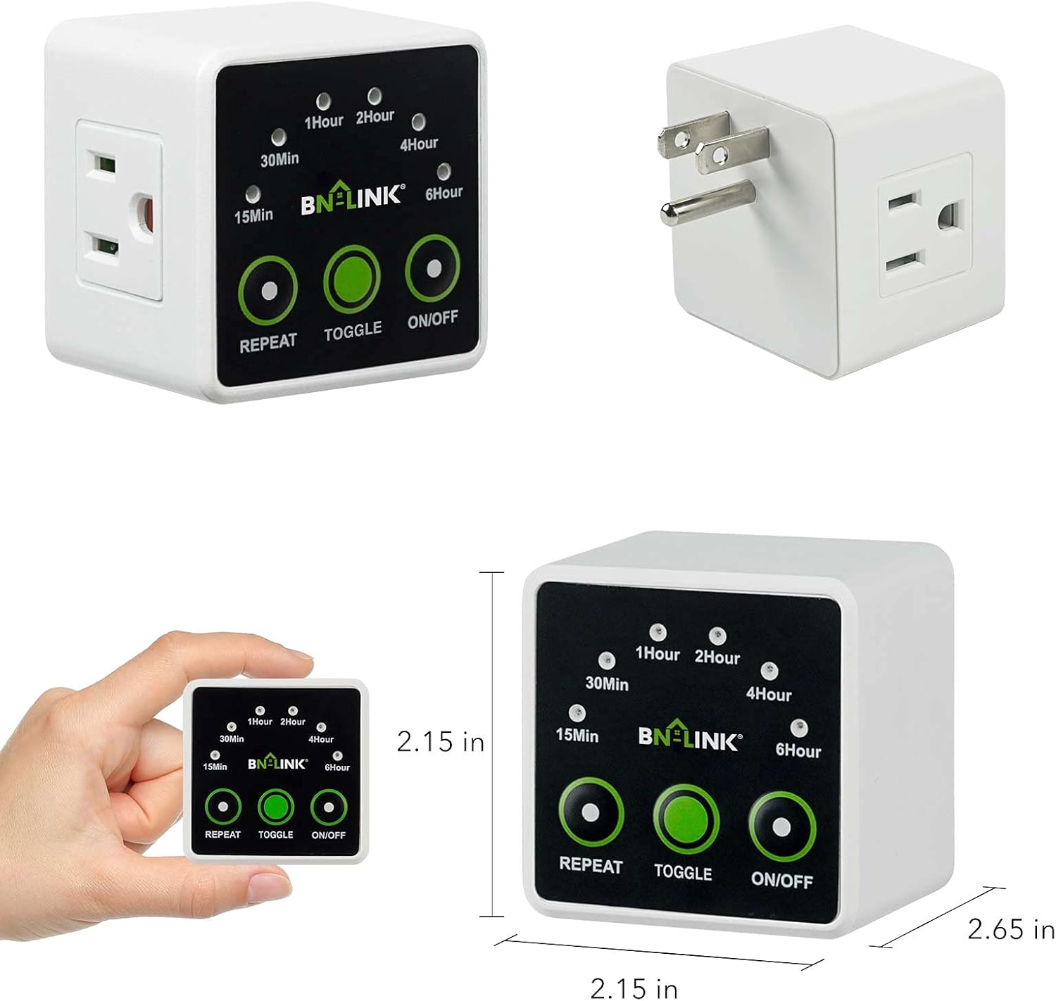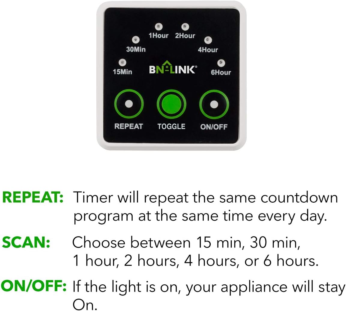 SIMPLE AND EASY TO USE: 6 Countdown Time Option (15min, 30min, 1hour, 2hour, 4hour and 6hour), 1 ON/OFF Override button, 1 Repeat button.