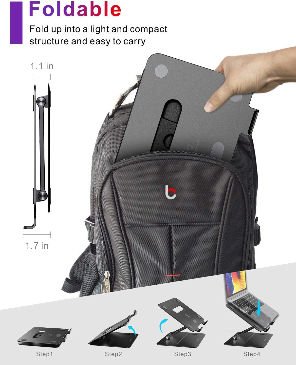 【Ventilated Cooling & Foldable】Laptop stand with aluminum alloy material on top can absorb and discharge heat at ease. What's more laptop riser has heat vent design increase natural airflow help you laptop cooldown, hence running at optimal performance longer, and even prolonging the life of your laptop. This computer stand can easily fold and fit into your bag and laptop case.