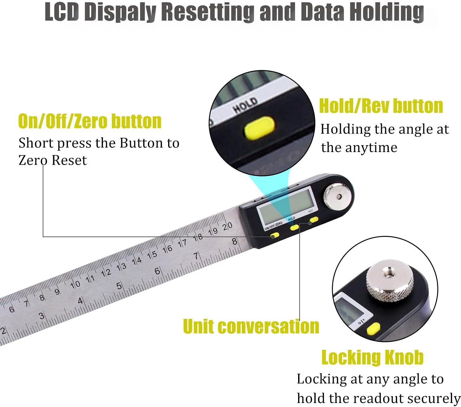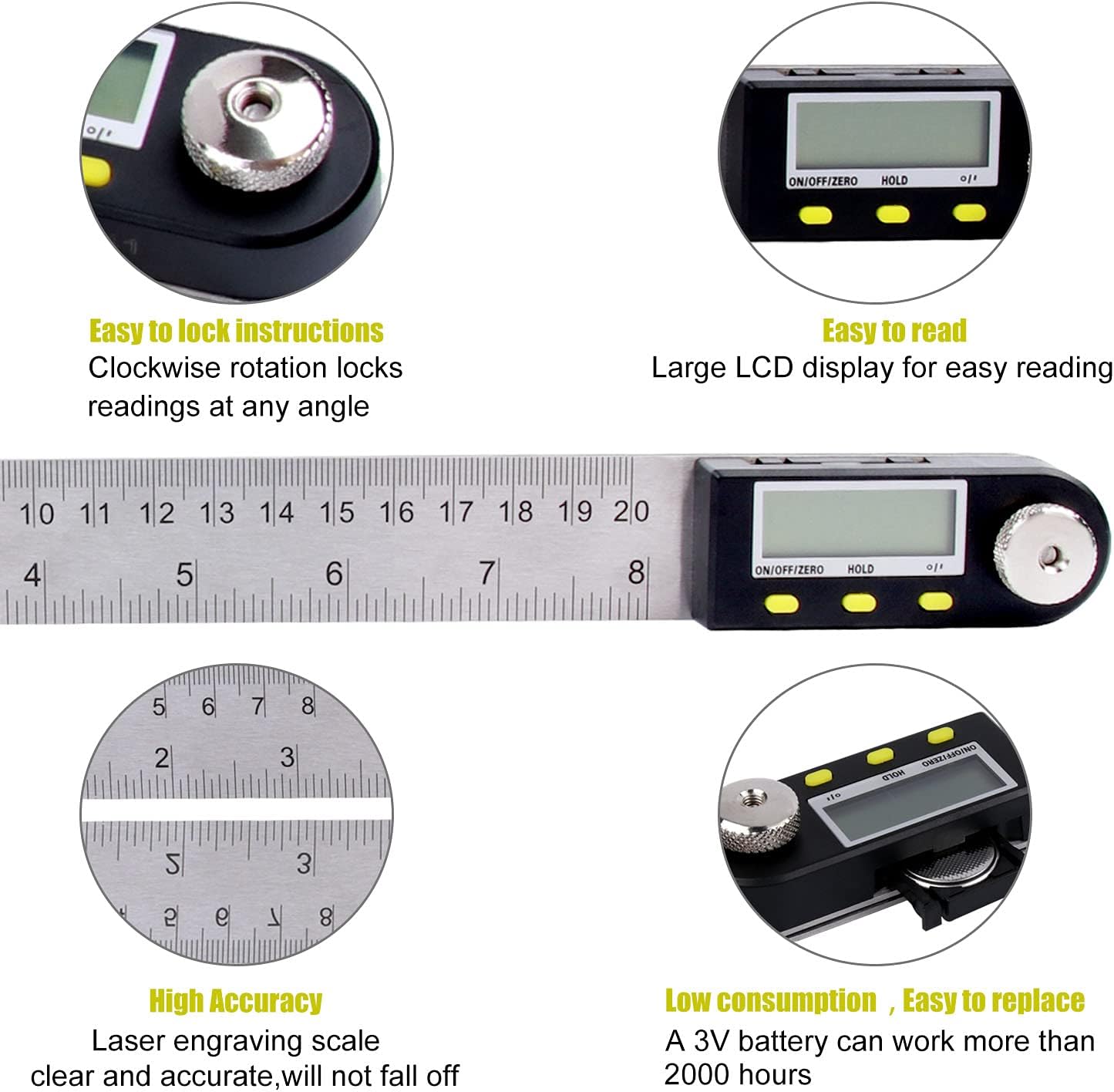 Delgada 8 inch/200mm Digital Angle Finder Ruler - Stainless Steel Protractor for Woodworking and Construction - Battery In...