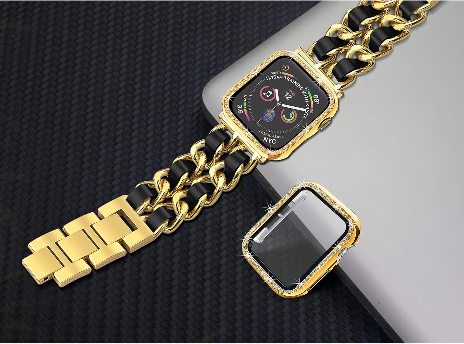 Pretty Chunky Chain Design: The bracelet adopts unique metal chain and leather strap cross weaving design, shows perfect combination of modest luxury and classic elegance. Matching up a bling protective case, felicitously protect and embellish your watch