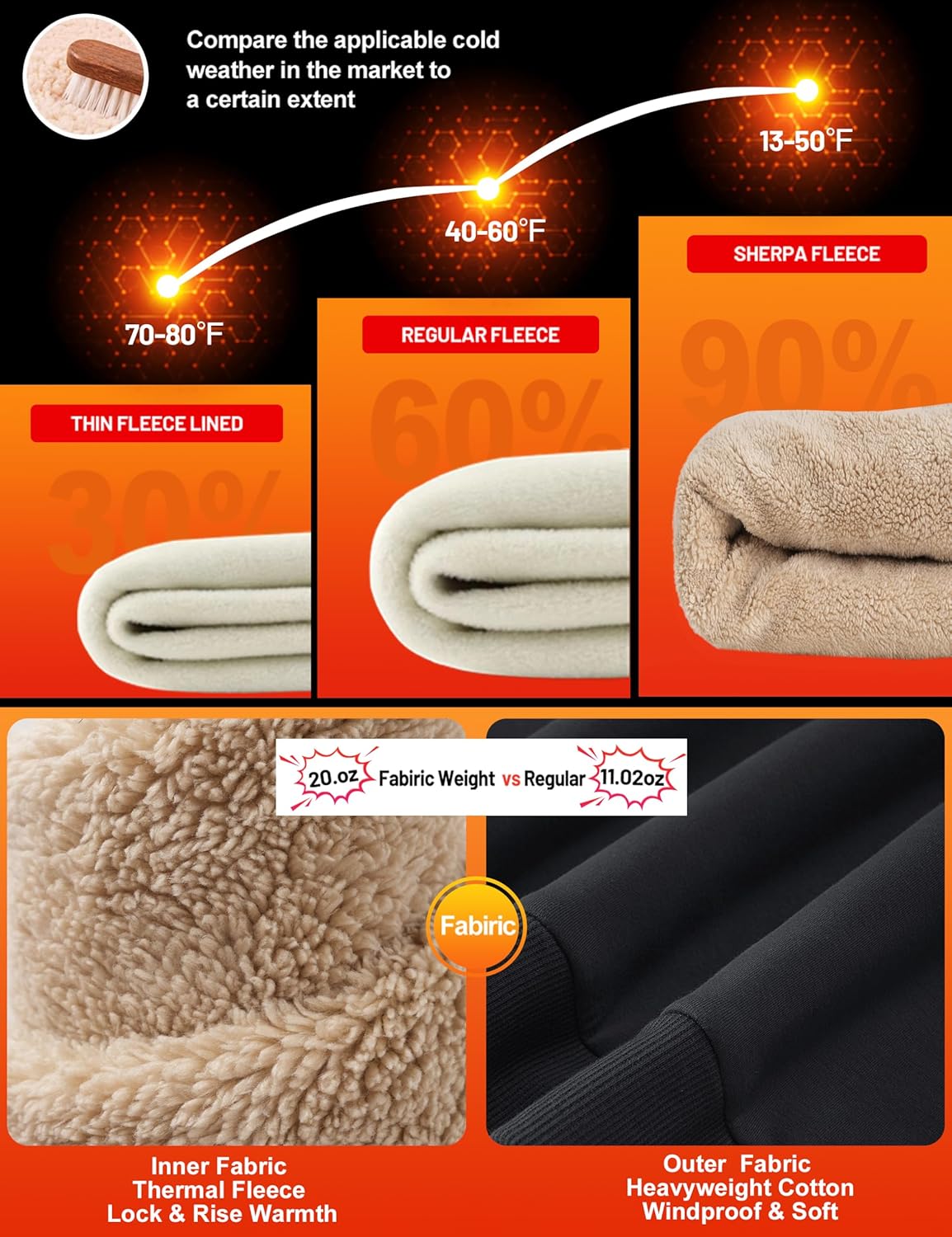 Material: Cotton, Sherpa, Fleece Lined. Warm, windproof and comfortable warm sherpa lined and soft thermal fleece keep you warm in cold weather.