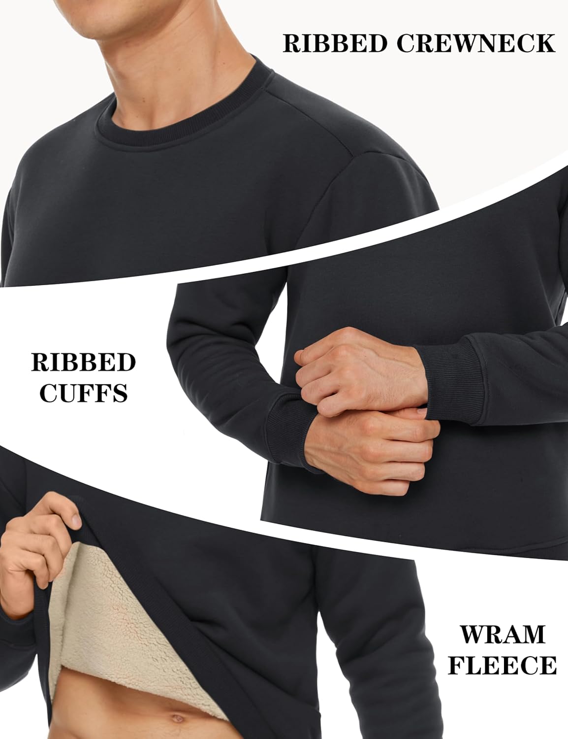 Crewneck: classic ribbed crewneck, long sleeve sherpa lined ribbed cuffs and hem.