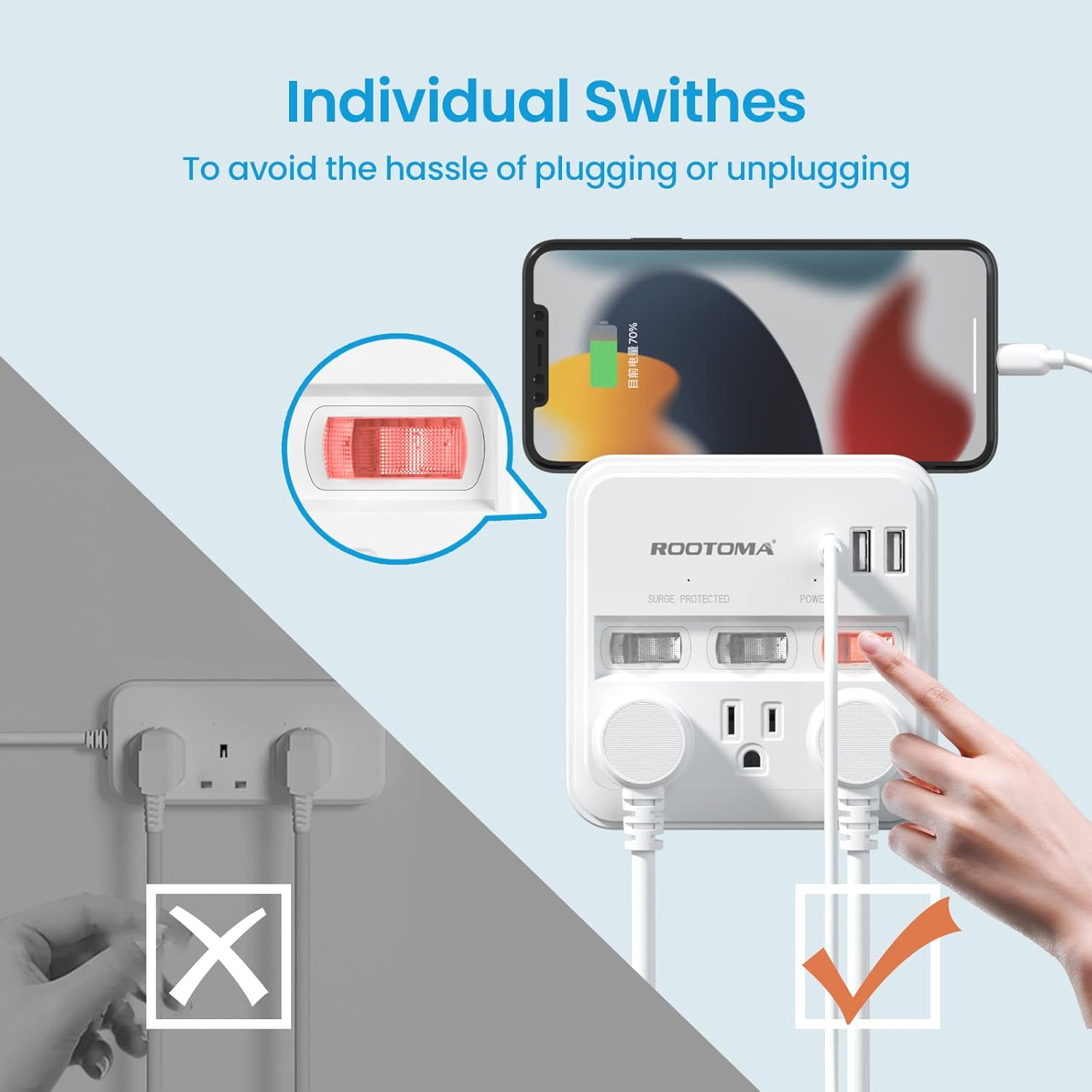【Cost-effective & Convenient Individual Switches】- This Multiple Outlet Wall Plug converts a standard wall outlet into a Multi Outlet Extender Expander with 3 individual power switches. Easily turn off a difficult-to-reach appliance for safety or energy savings. It is convenient to quickly turn off the power without having to constantly plug and unplug the power cord from the wall.