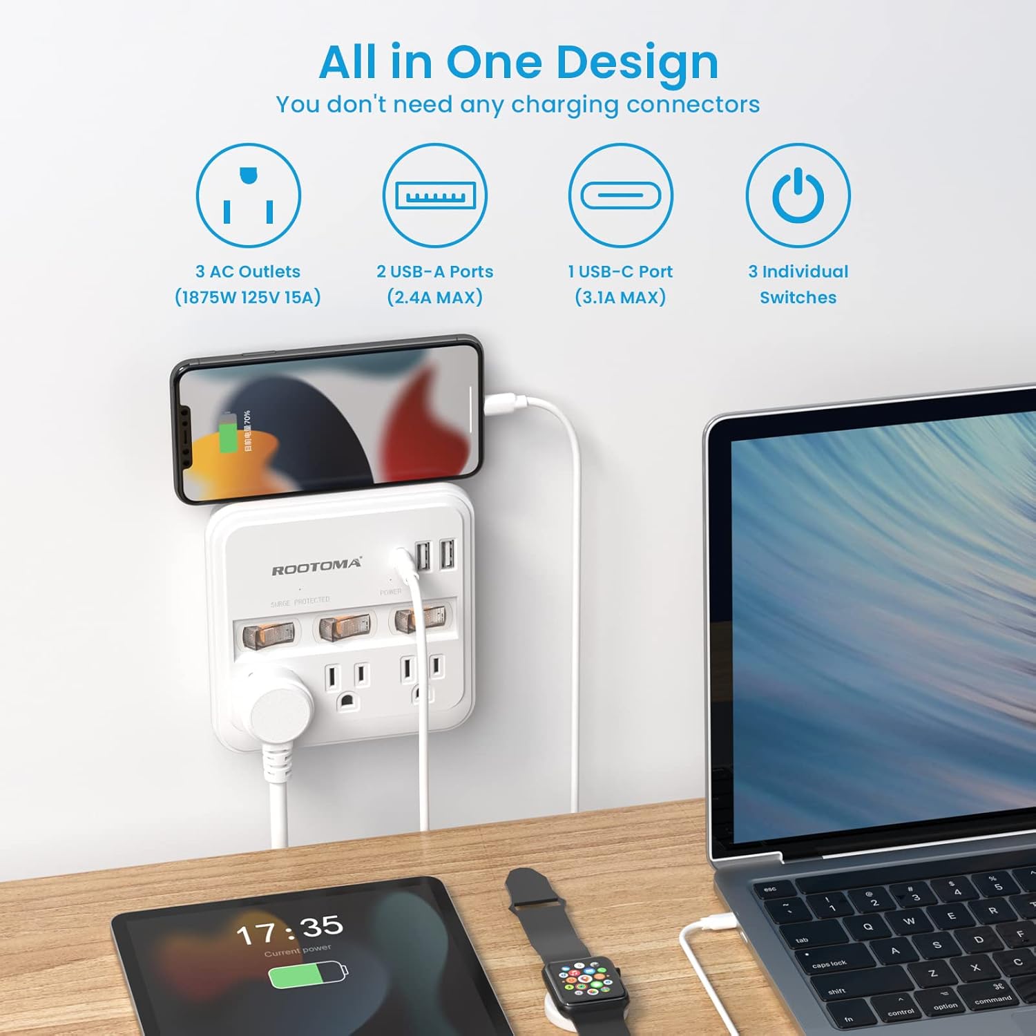 【USB C Charging】- ROOTOMA USB plug extender with USB C and 2 USB A ports, supports 15W/ 3.1A in total. (USB C port supports 15W Max. Per USB-A port supports 15W MAX) With built-in smart charging technology can auto-detect and deliver appropriate current to your devices. NOTE: The USB-C port DO NOT support any other laptops which need 14~22V charging voltage.