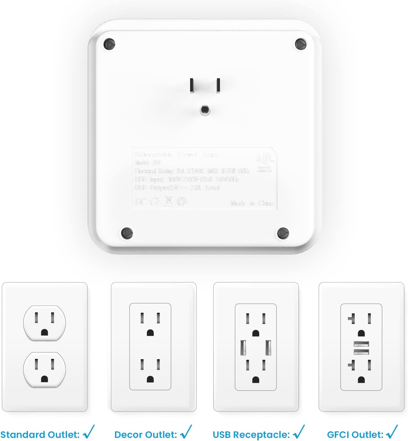 【Wall Outlet with USB Ports】 2 USB charger ports, 1 Type-C port (total output DC 5V/3.1A) and 3 AC outlet Plugs with built-in surge protector. It supports 7 electric devices simultaneously. USB Wall Plug perfect for cell phones, iPad, laptops, lamp, cameras and many other devices.