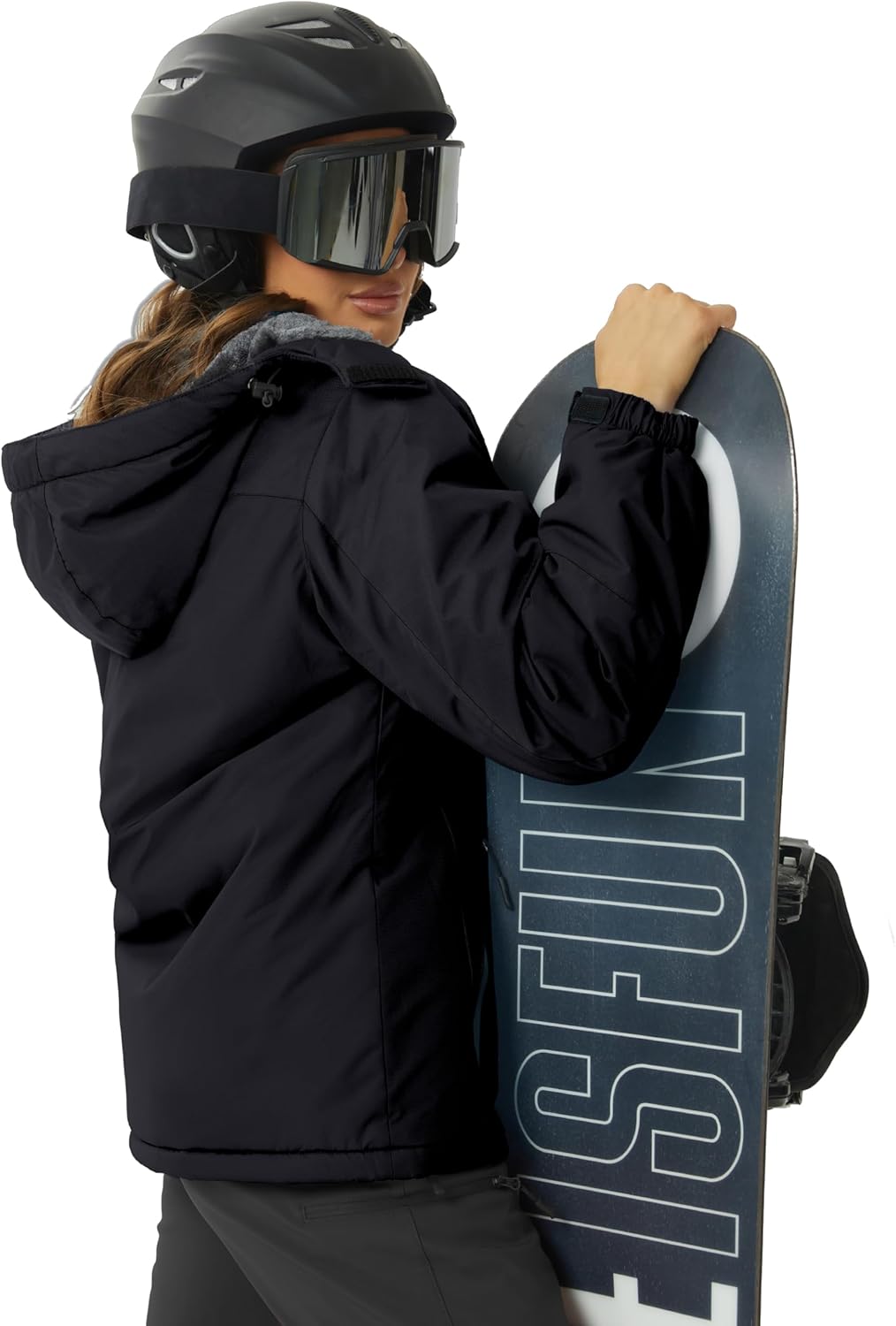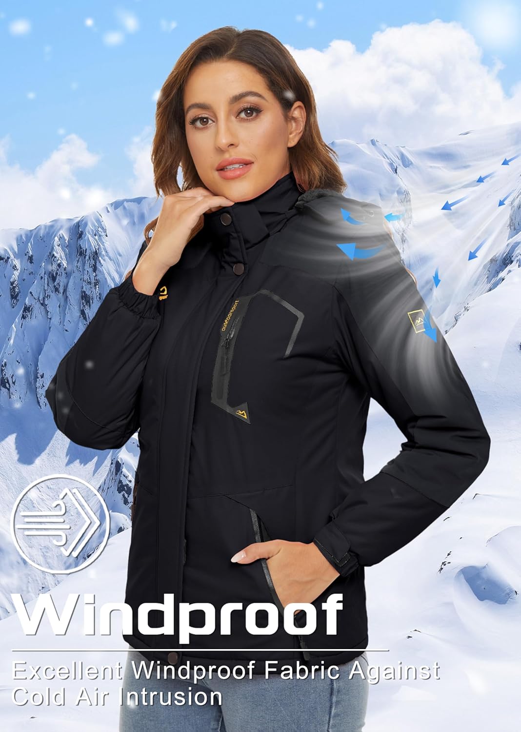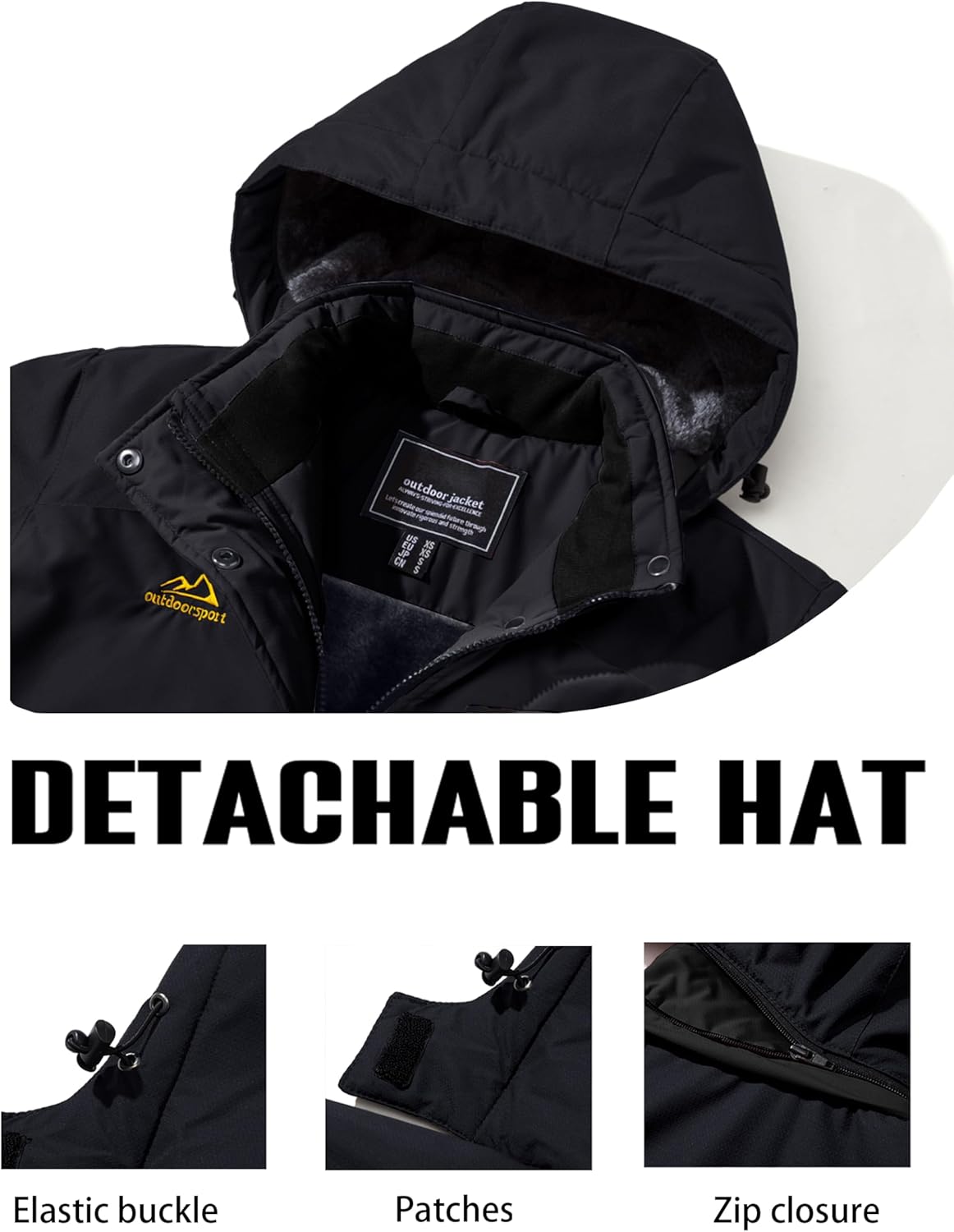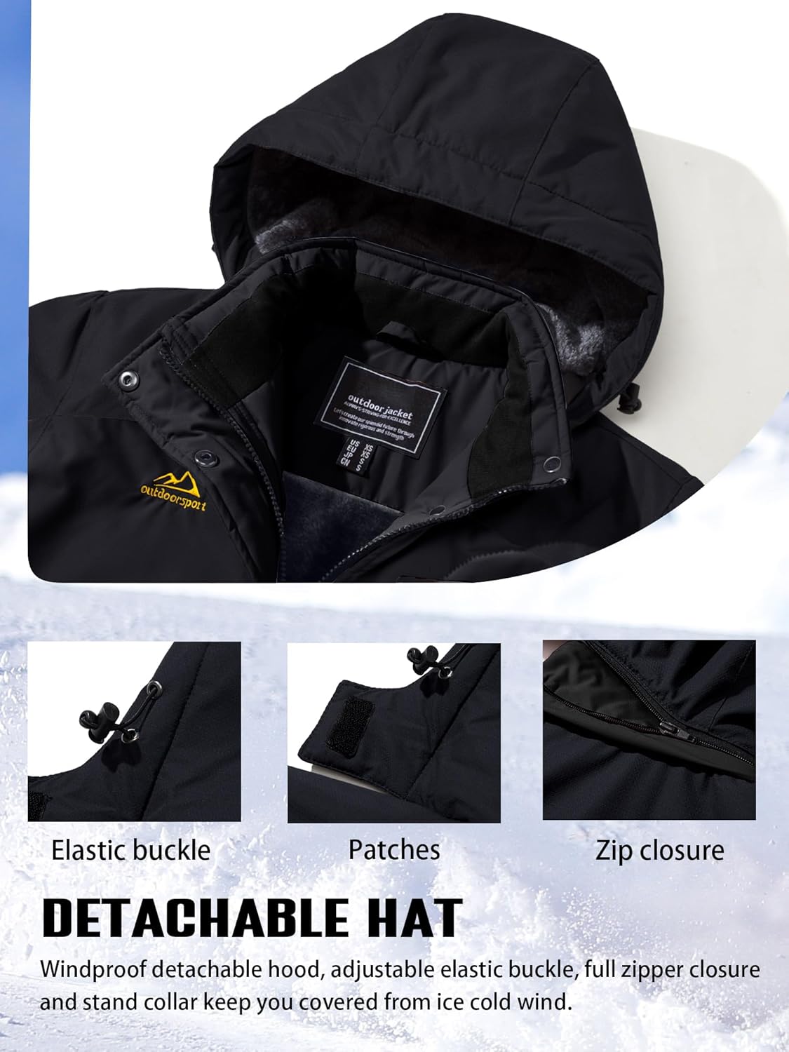 [ WINDPROOF ]: This ski jacket is made of windproof material. It is equipped with a detachable hood with a zipper, adjustable hook-and-loop sleeve cuffs, a stand collar, and a full-zip closure, which can effectively protect you from the cold wind.
