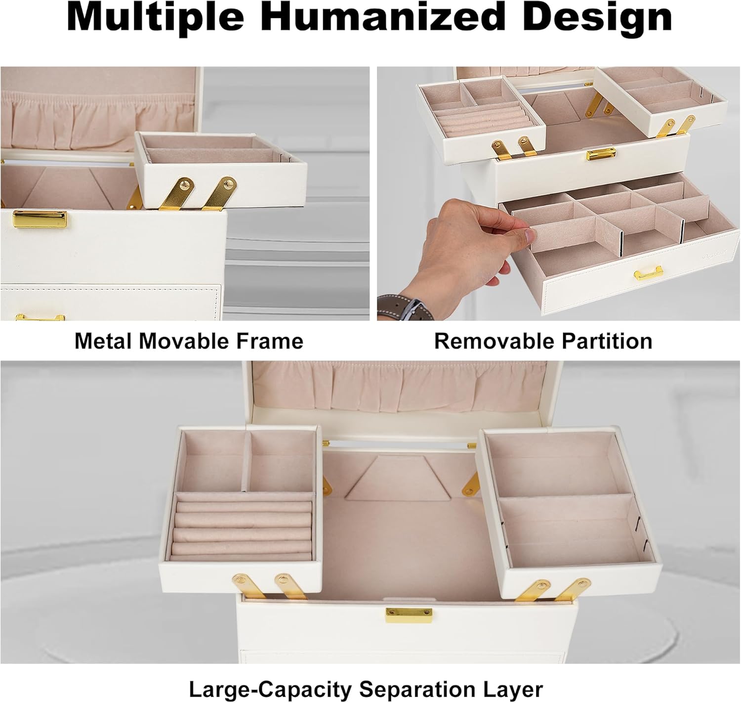 3 Layers of Large Capacity: The large jewelry storage box has 5 ring slots, 9 ring boxes, 10 necklace hooks, 26 ear stud holes, 2 adjustable space compartments, when you stretch them out, you will find a large compartment hidden underneath, a large space for large pieces of jewelry you want to put. The jewelry organizer box has a variety of designs and compartments, which can store all your jewelry, whether it is a large piece of jewelry or a small earring, there is a place to store it