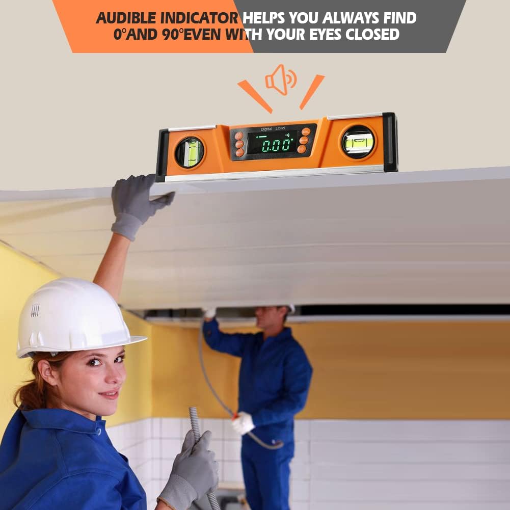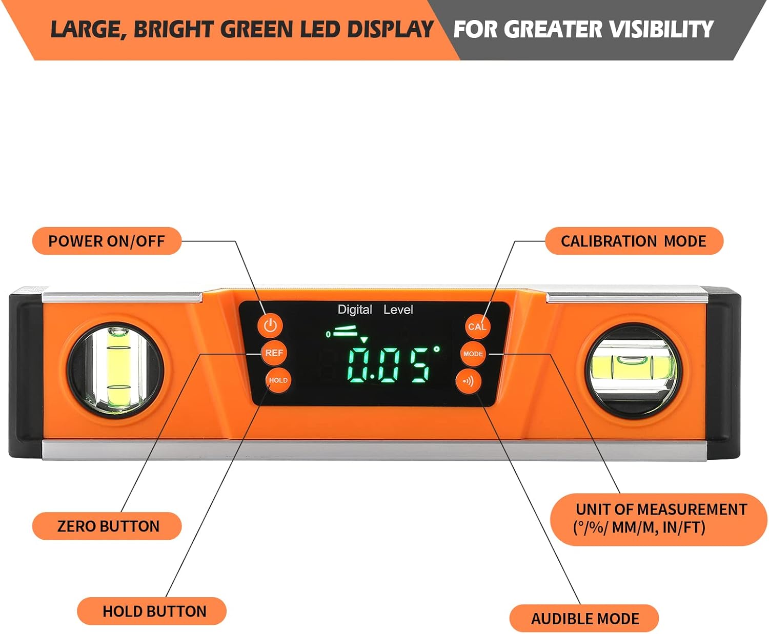 LARGE, BRIGHT GREEN LED DISPLAY With AUDIO INDICATOR -- This level features a large, bright LED display that flips, so you can easily read your measurements all day and night – even in the darkest spaces. What's more, we craft our digital level with audio indicator functionality, so you can achieve level and 90 degrees even with your eyes closed
