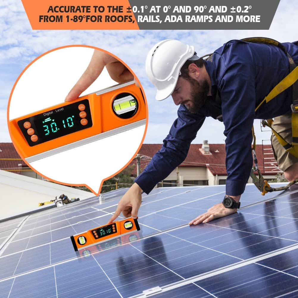 HIGH-ACCURACY -- Accurate to the ±0.1° at 0° and 90° and ±0.2° from 1-89°.; displays angle and bevel readings in degrees, pitch IN/FT, mm/M, and percent slope. Great for roofs, rails, ADA ramps