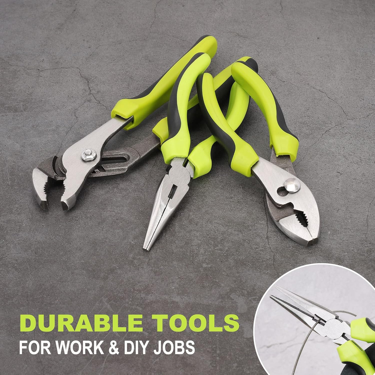 Includes slip joint pliers, groove joint pliers, adjustable wrench, long nose pliers, magnetic screwdriver holder, screwdriver bits, tape measure.