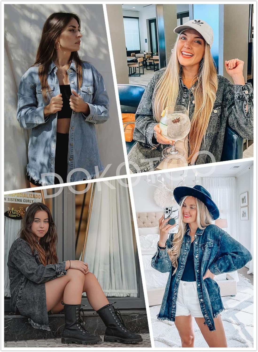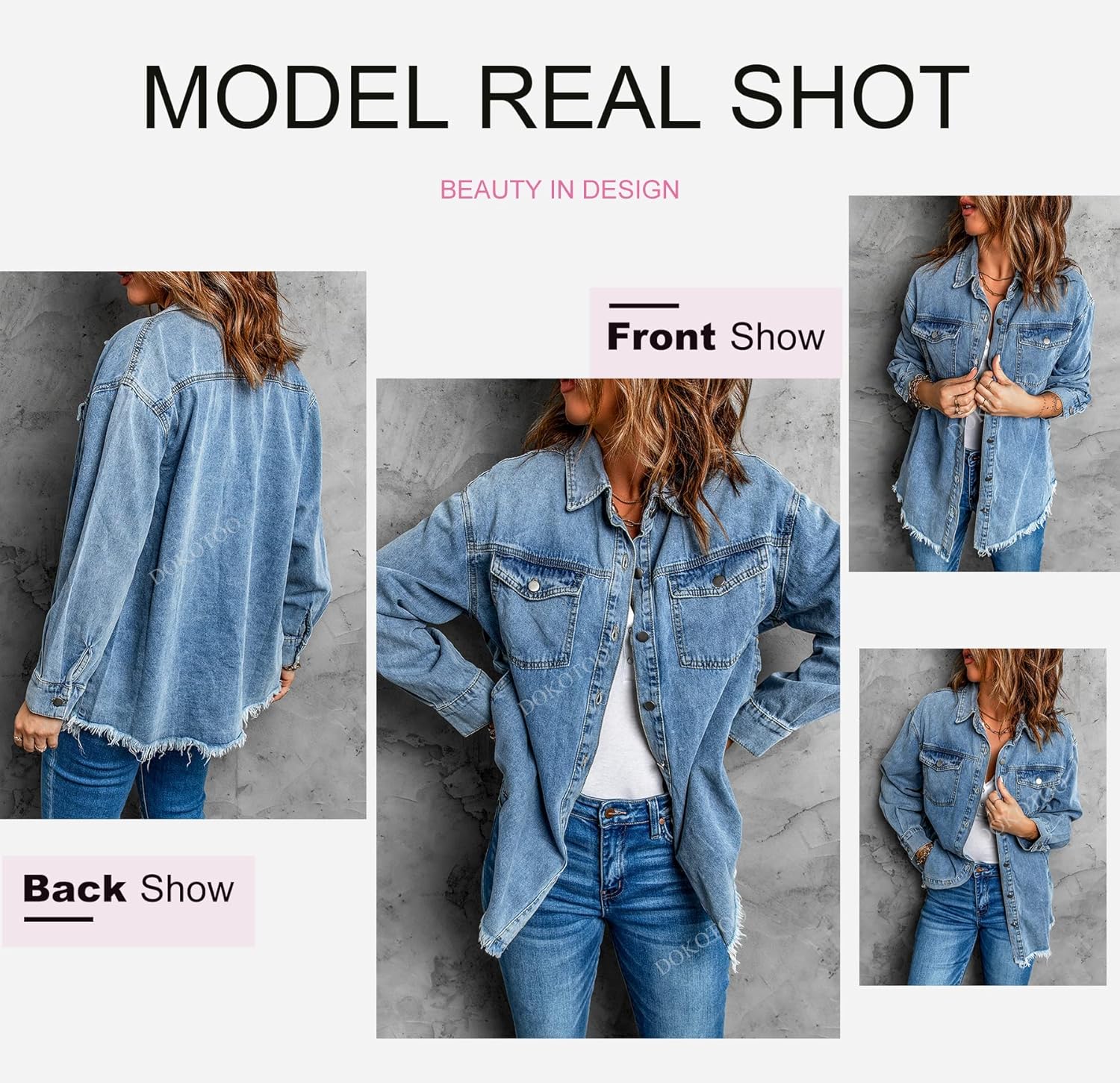 Dokotoo Women's Oversized Denim Jacket Casual Long Sleeve Denim Shirts Distresse Jean Jacket 2025 Spring Outfits