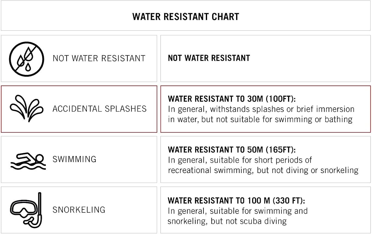 Water resistant to 100 feet (30M)