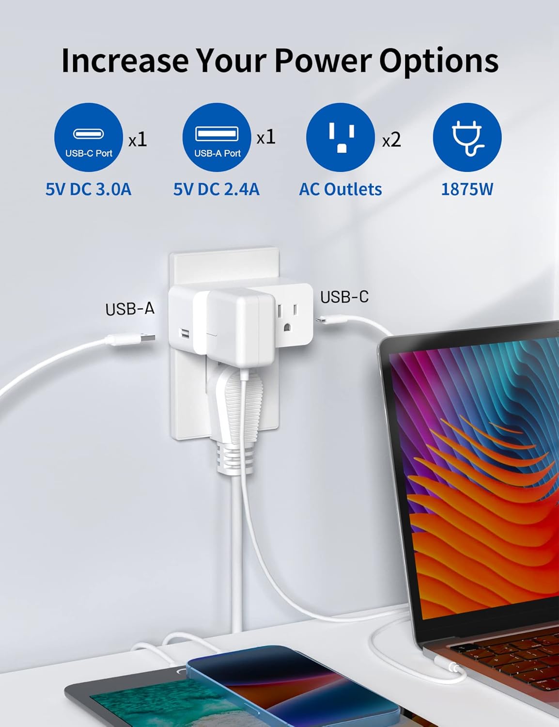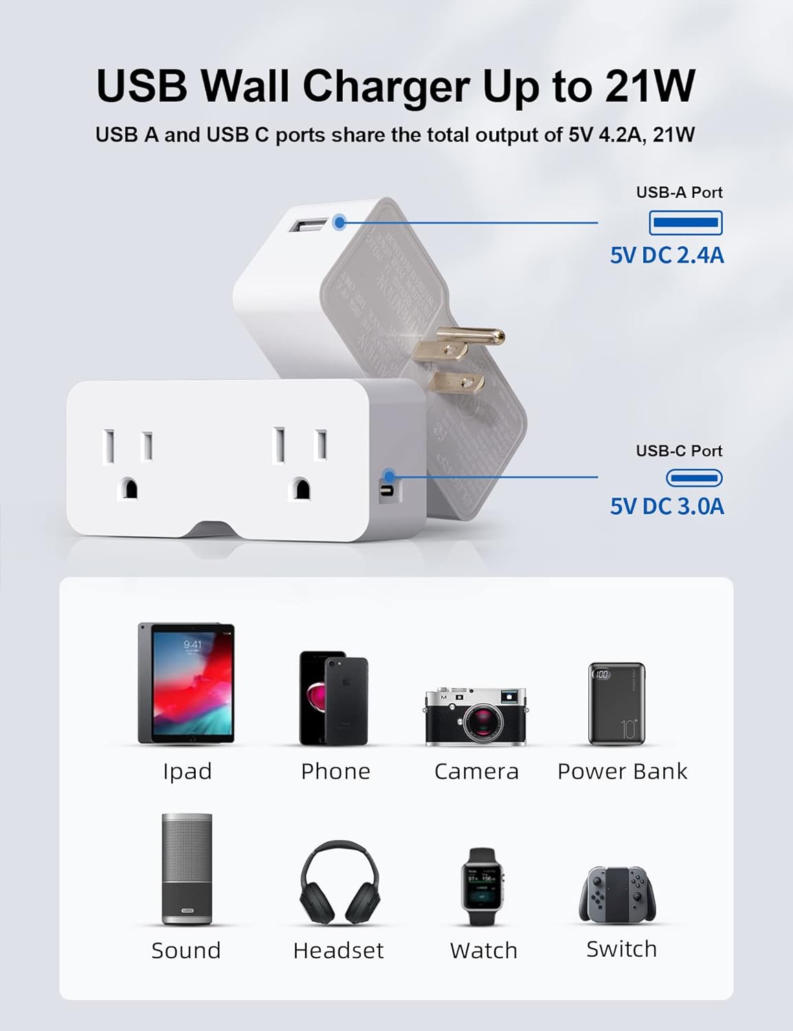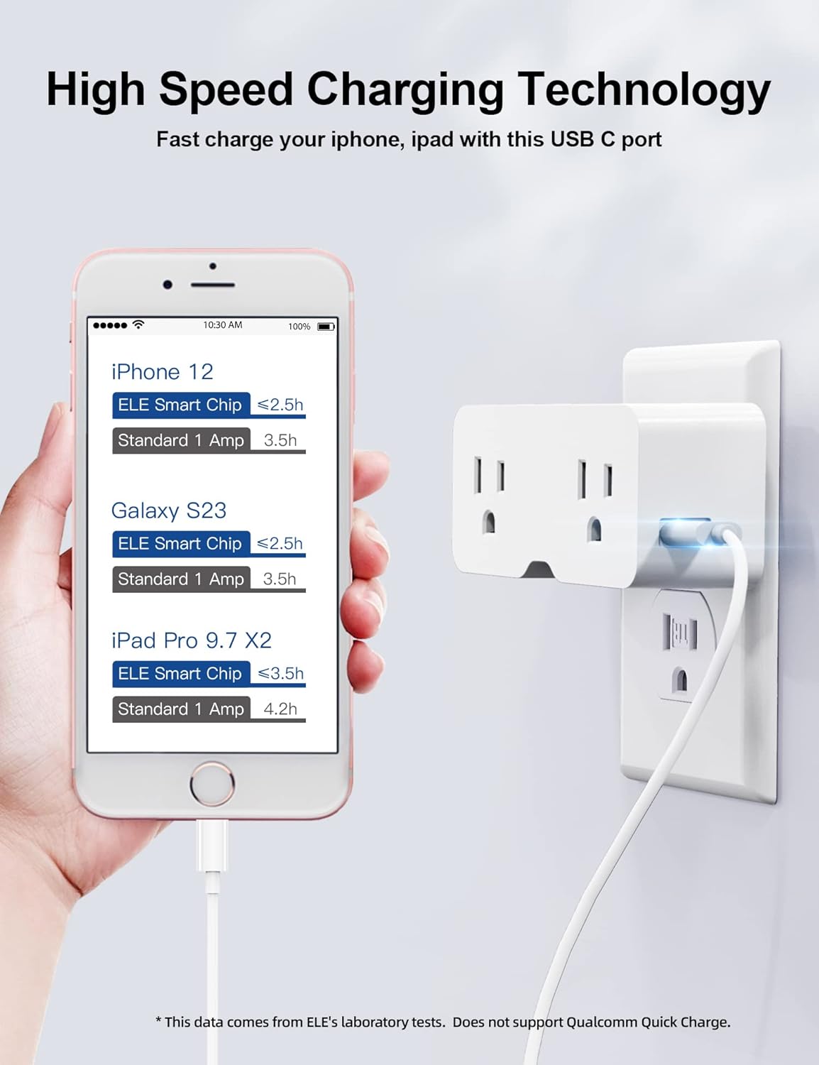 ELEGRP USB Wall Outlet Extender, Multi Plug Outlet Splitter with USB C and USB A Ports 21W, Electrical Outlet Extender Wal...